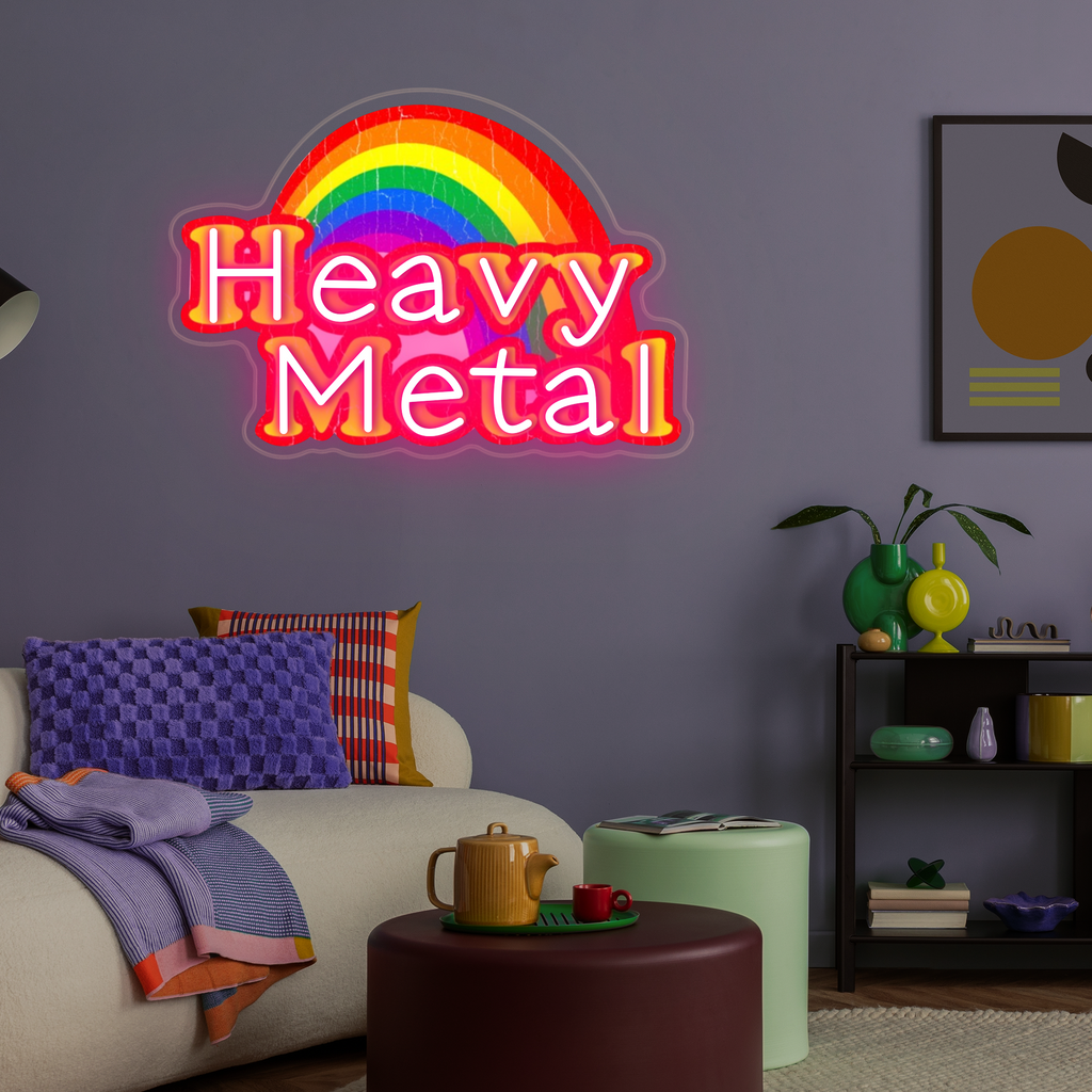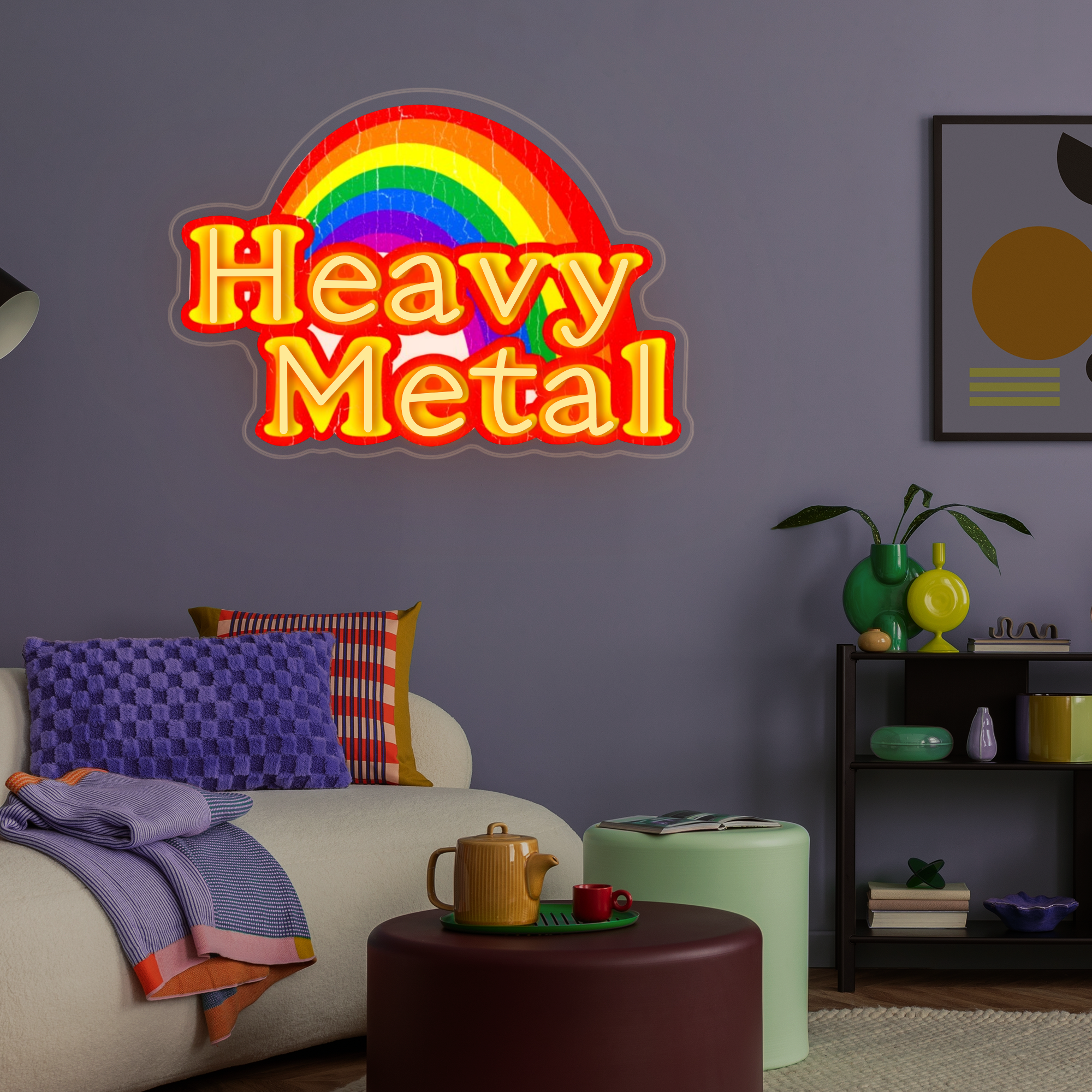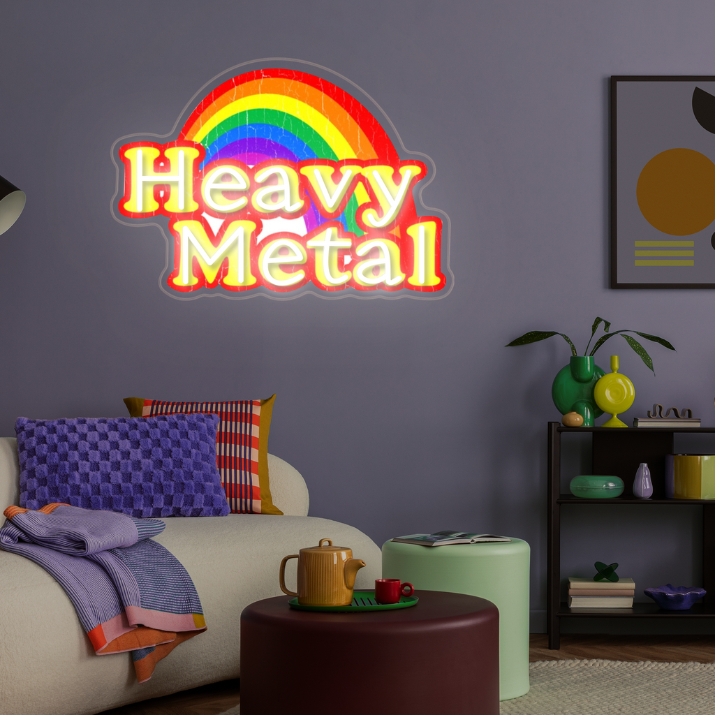 Layered Contrast Design: Features a vibrant UV-printed rainbow arcing above sharp, angular "Heavy Metal" text in classic neon script, creating a striking visual hierarchy