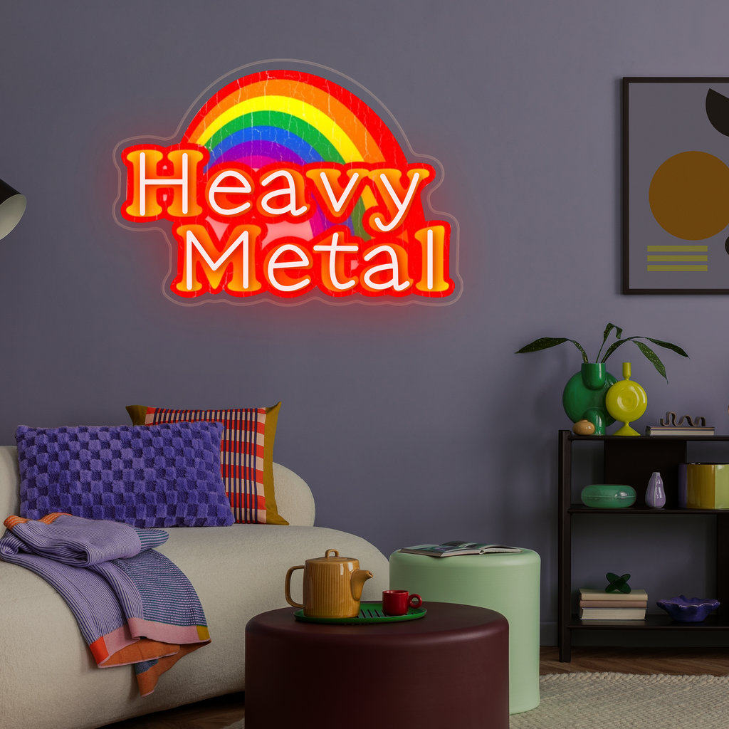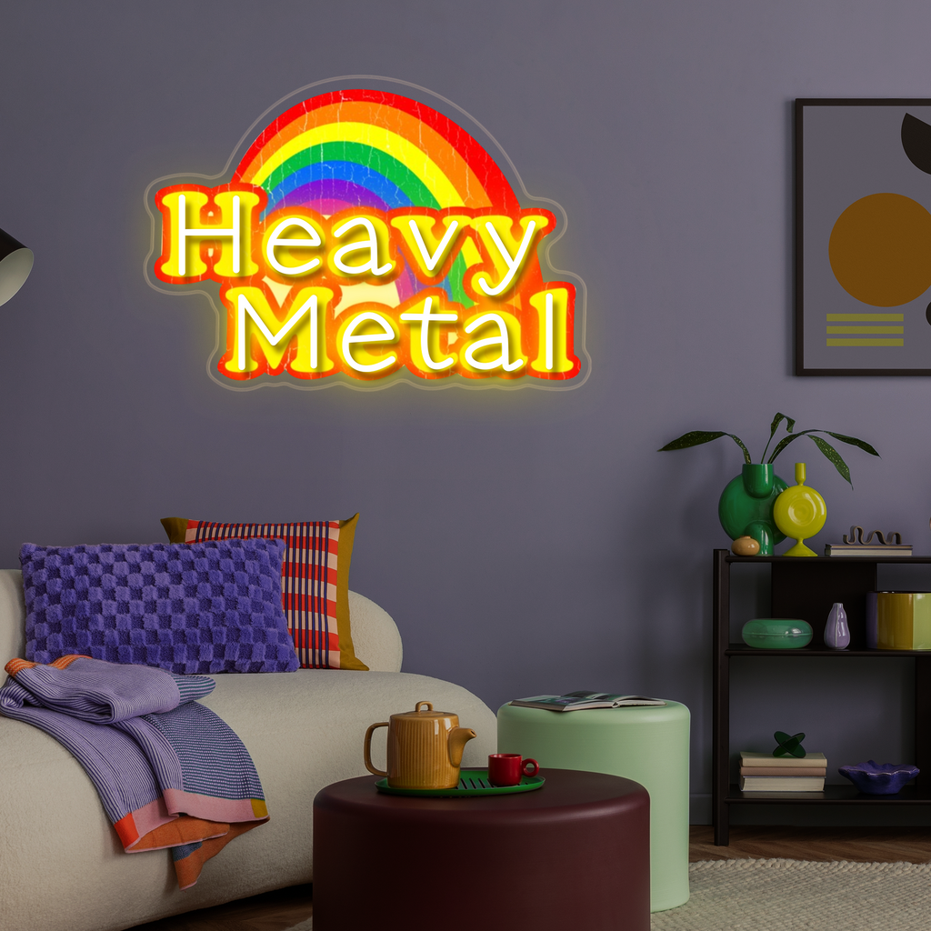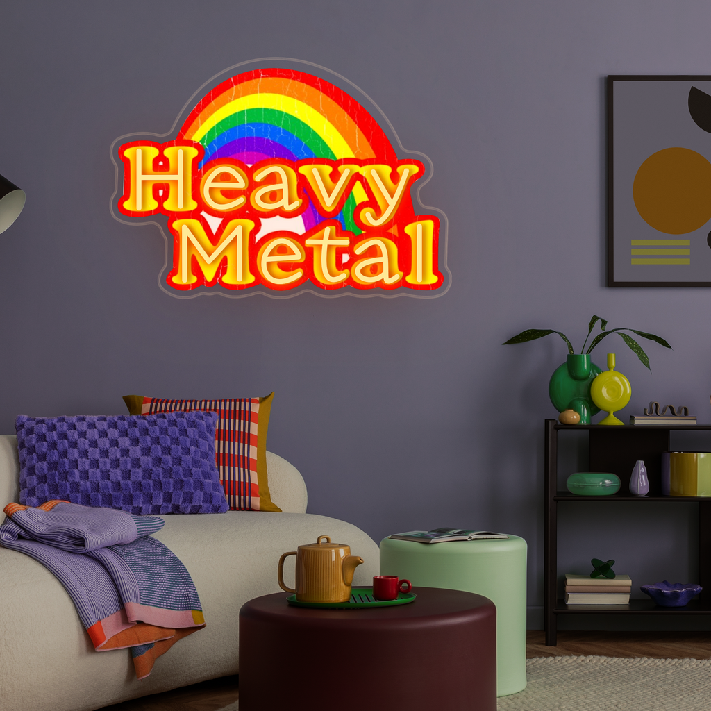 Layered Contrast Design: Features a vibrant UV-printed rainbow arcing above sharp, angular "Heavy Metal" text in classic neon script, creating a striking visual hierarchy