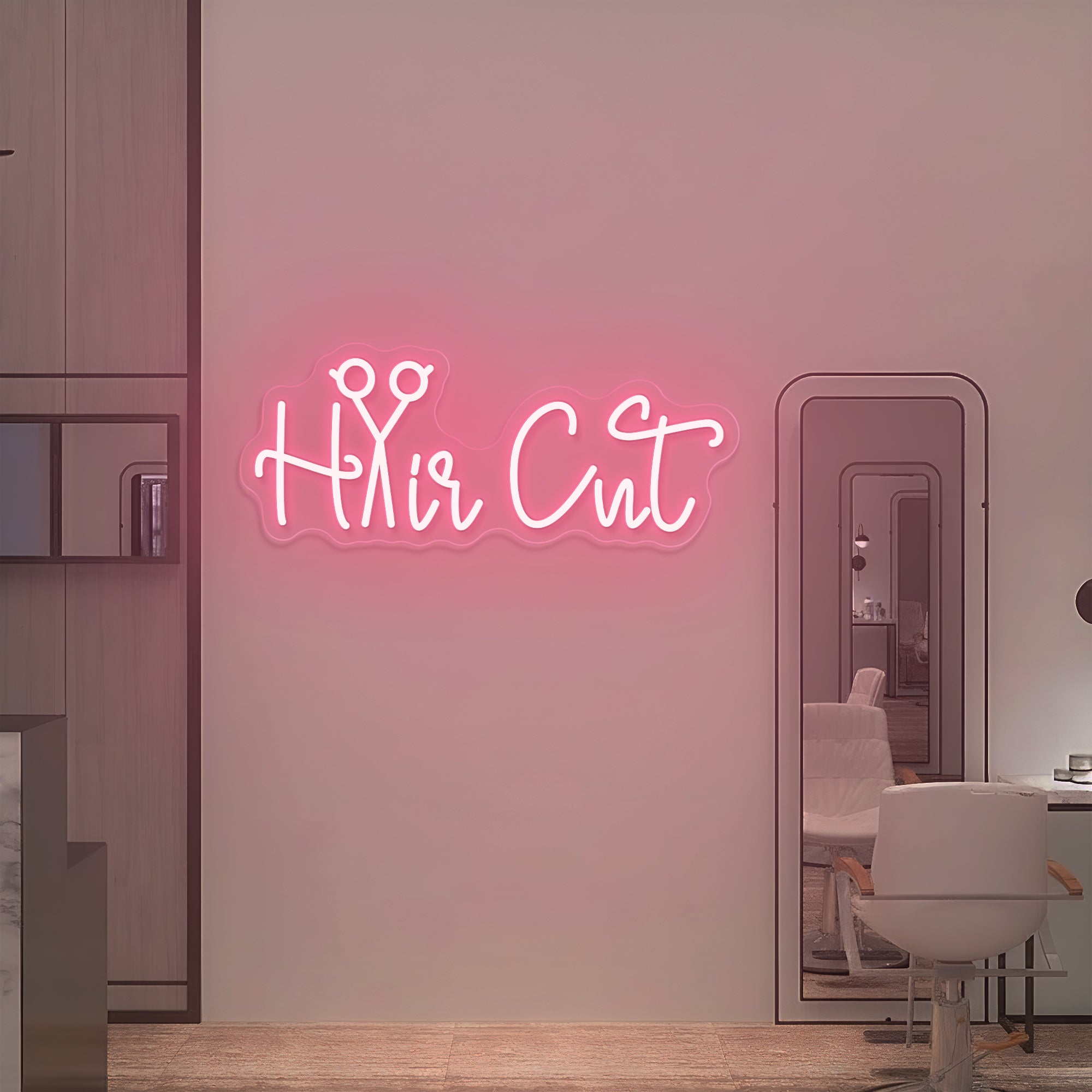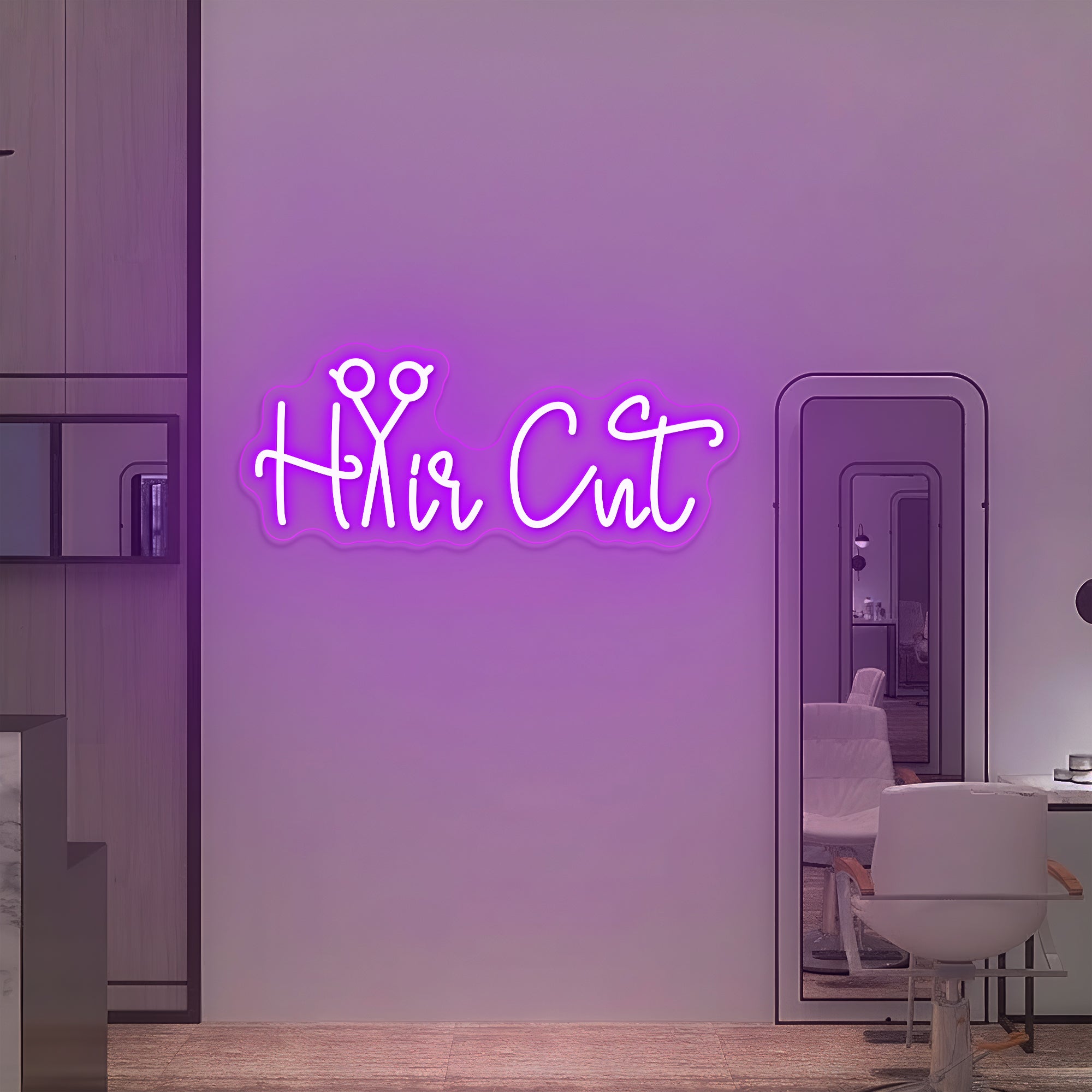Sharp & Stylish Glow: Emits a crisp, inviting light that captures the energy and sophistication of a modern salon. It shines in a palette perfect for beauty spaces: the “Hair Cut” lettering glows in chic shades like cool white, rose gold, vibrant pink, or classic blacklight-reactive hues, while the scissor “a” sparkles in a complementary metallic or bold accent color. This even, brilliant illumination makes every element—from the confident lettering to the sharp blades of the scissors—pop with clarity, casting a light that is both professionally polished and creatively inspiring.