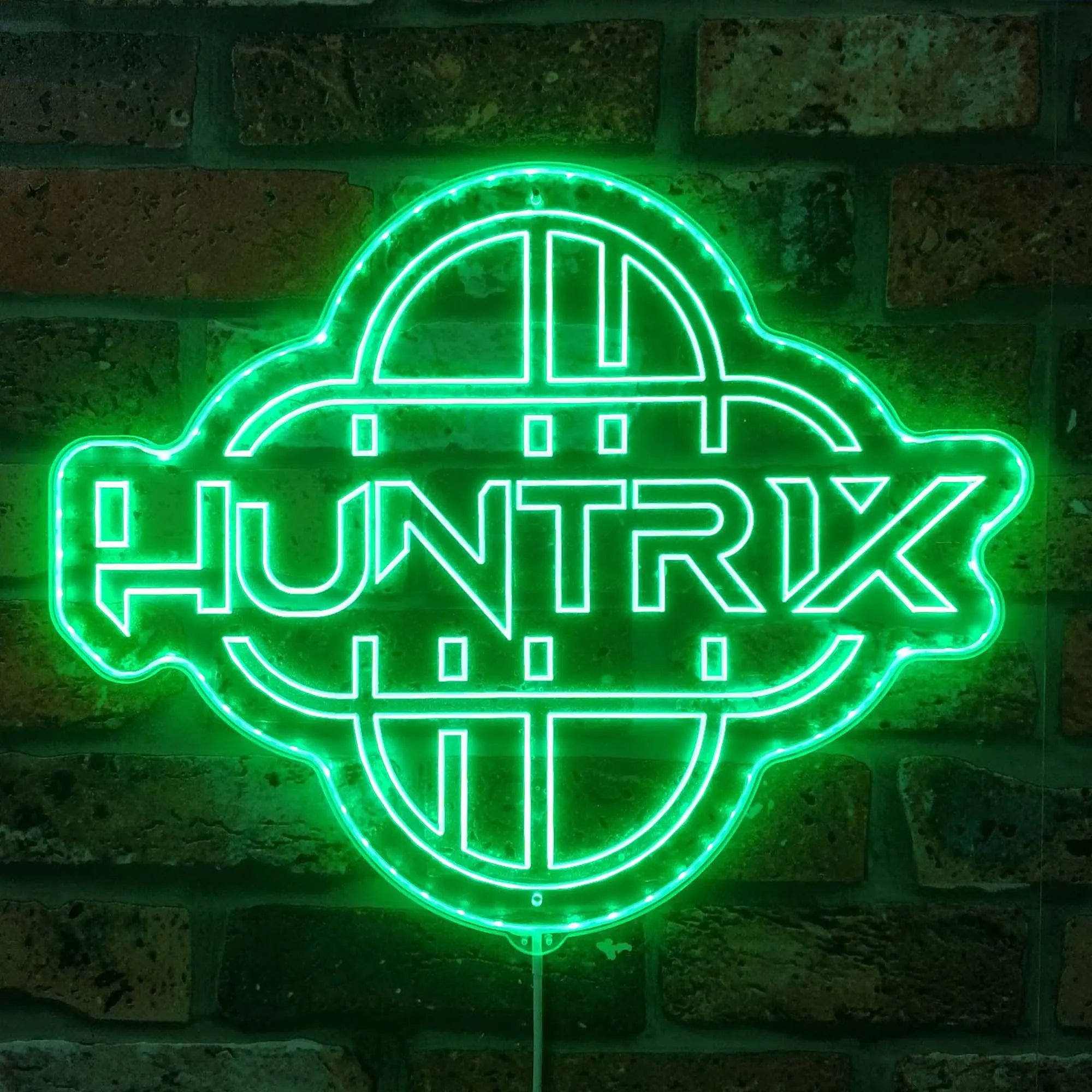 Futuristic Fusion Graphic Design: This electrifying sign masterfully blends K-pop energy with cyber-fantasy aesthetics. Its central focus is the powerful custom moniker "HUNTRIX", rendered in a sharp, dual-line futuristic font that suggests both speed and authority. The name is dynamically framed above and below by pulsating wave-like circular patterns—resembling digital soundwaves, energy ripples, or targeting interfaces—creating a sense of amplified power and rhythmic motion. This cohesive composition, expertly crafted in multi-color LED neon, visually narrates a story where cutting-edge sound meets high-stakes pursuit.