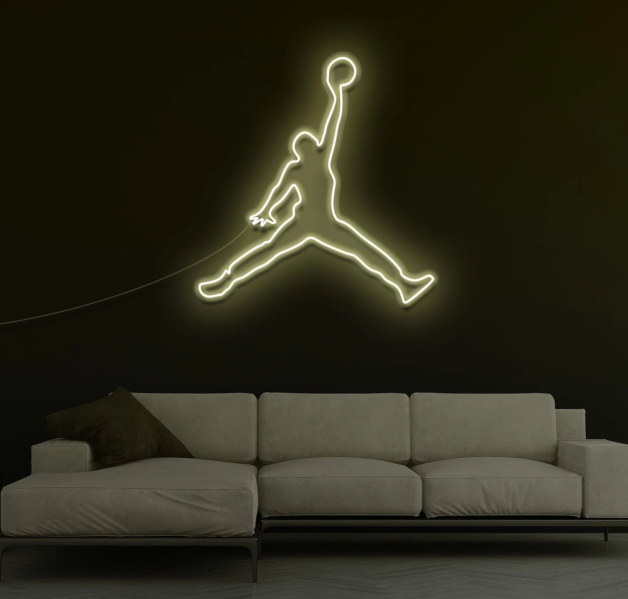 Iconic Jumpman Silhouette Design: This electrifying sign features the legendary Jumpman logo—the iconic silhouette of Michael Jordan in mid-air dunking—crafted in dynamic, clean LED neon lines. It instantly evokes the legacy, athleticism, and style of the greatest basketball player of all time.