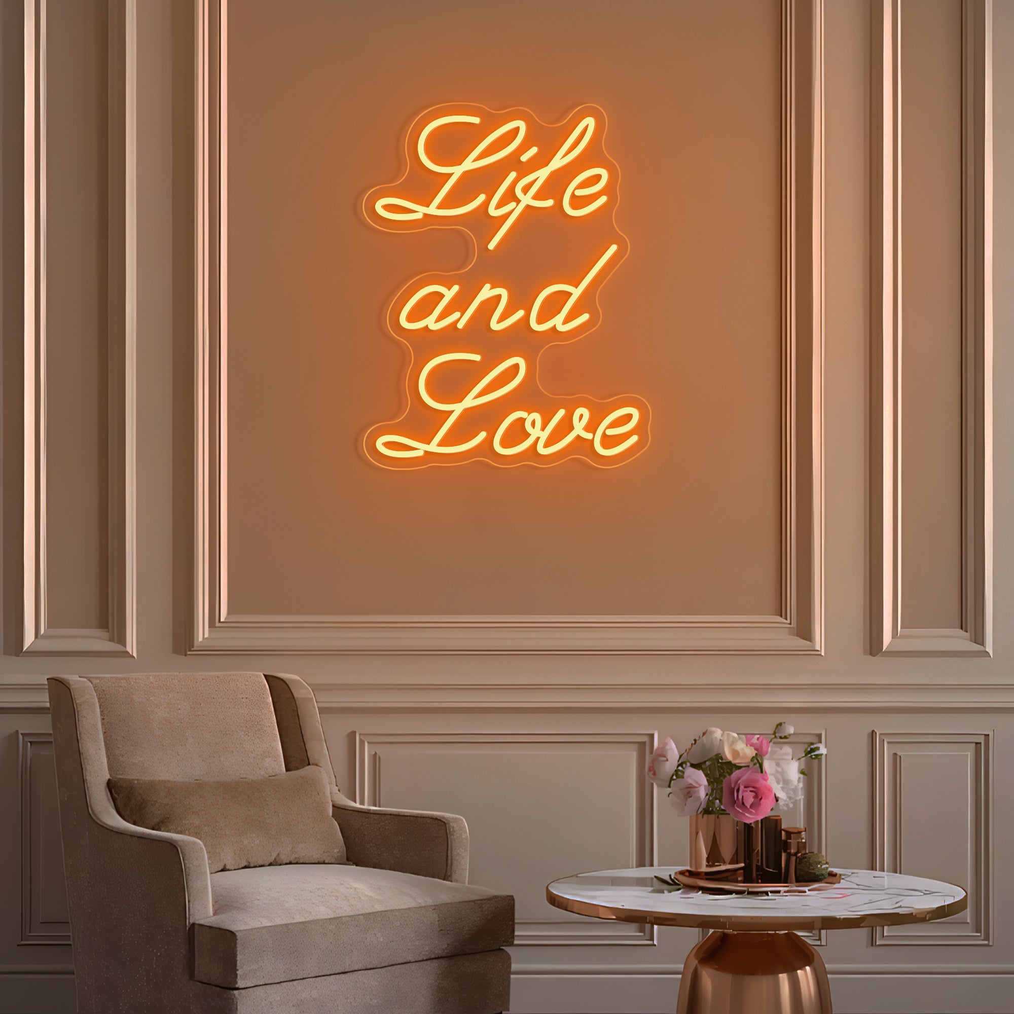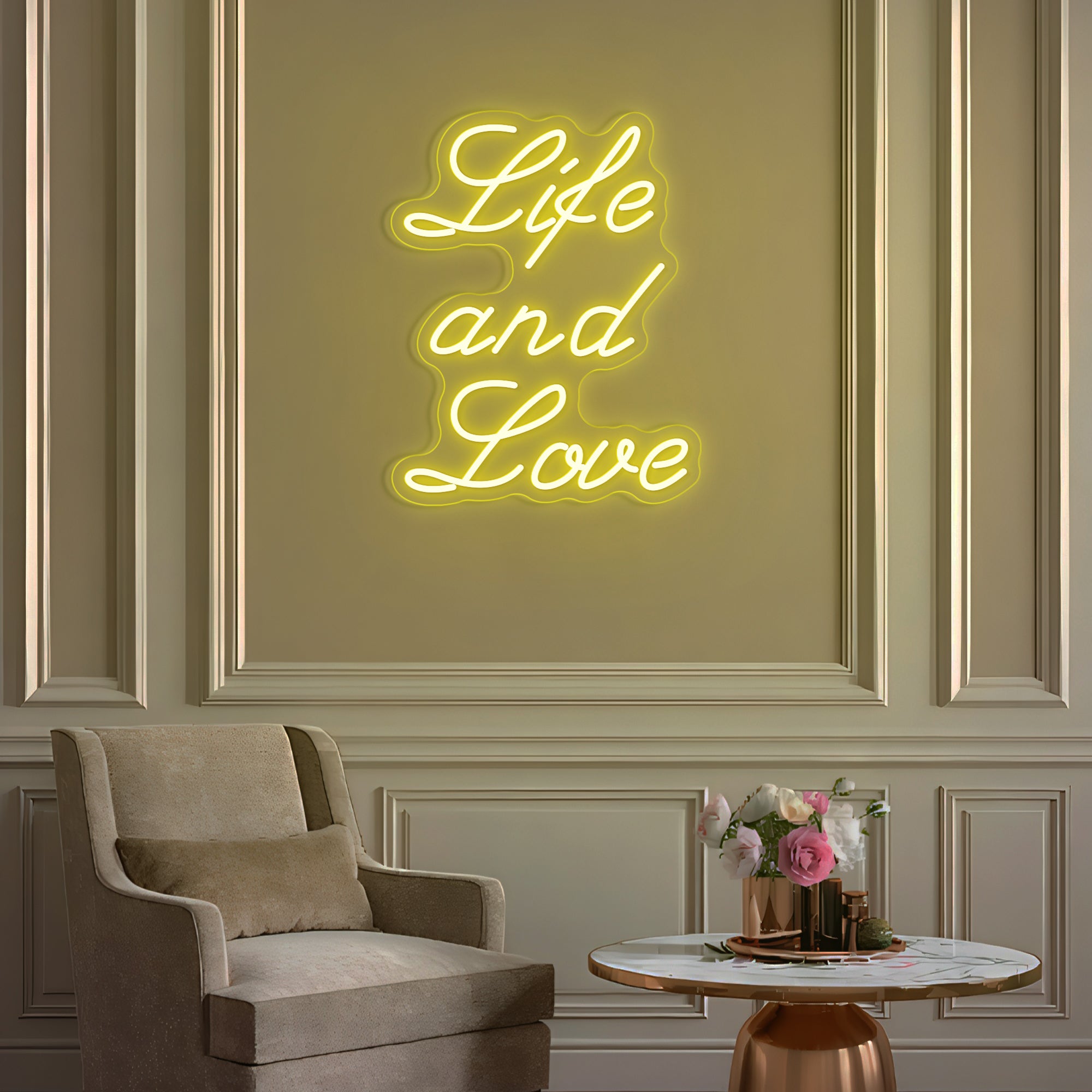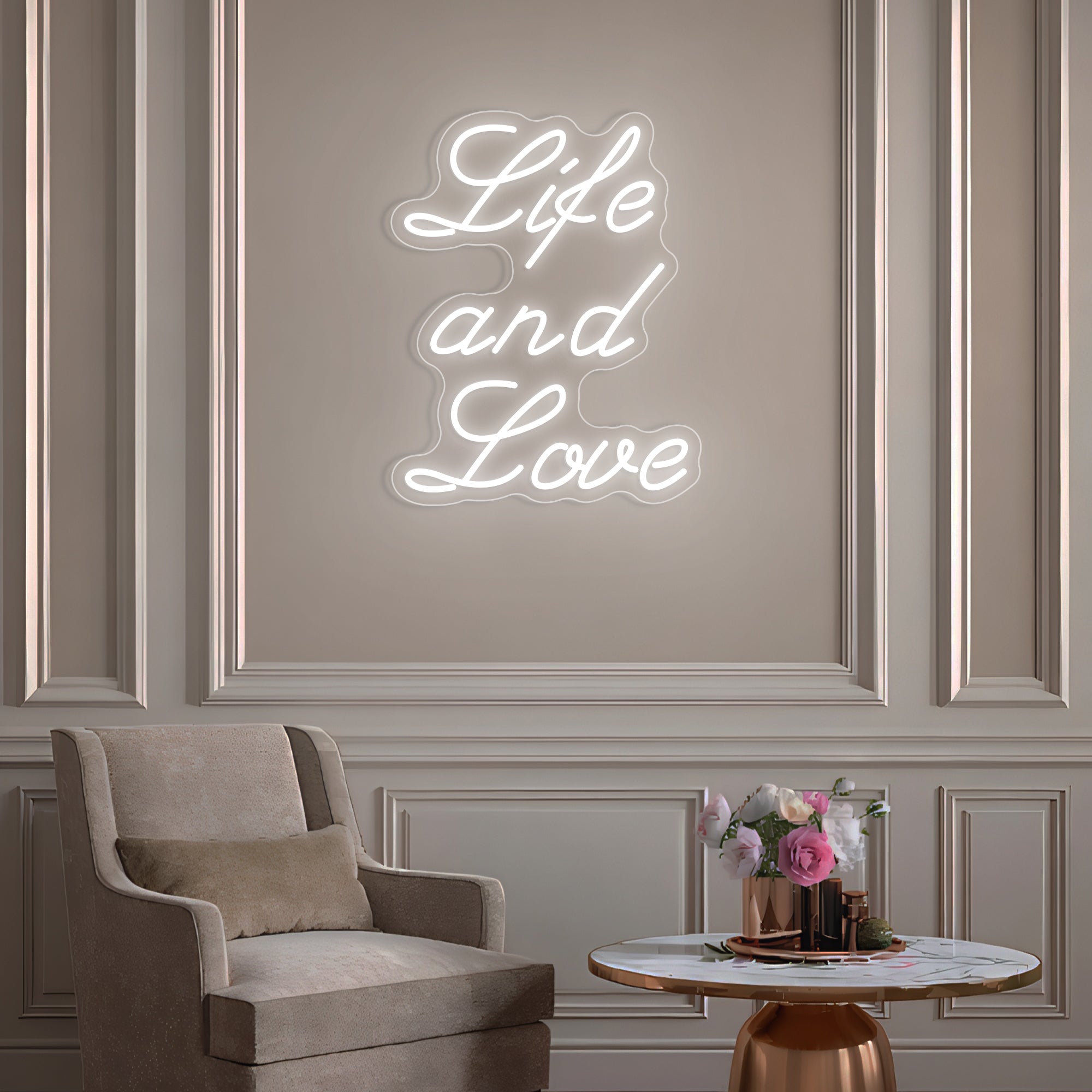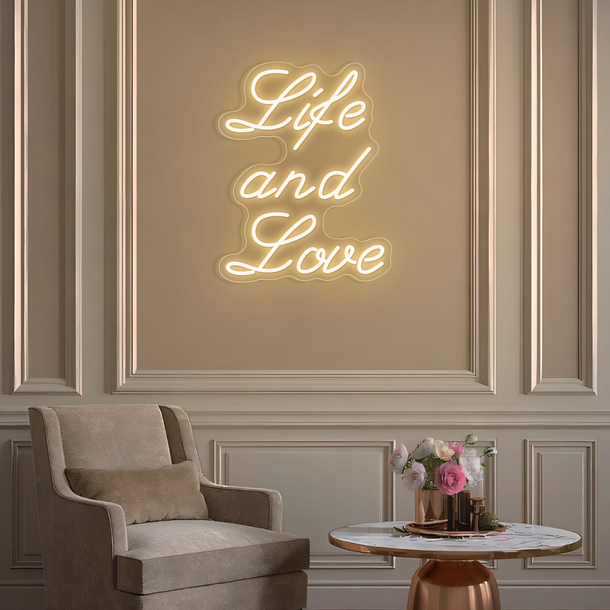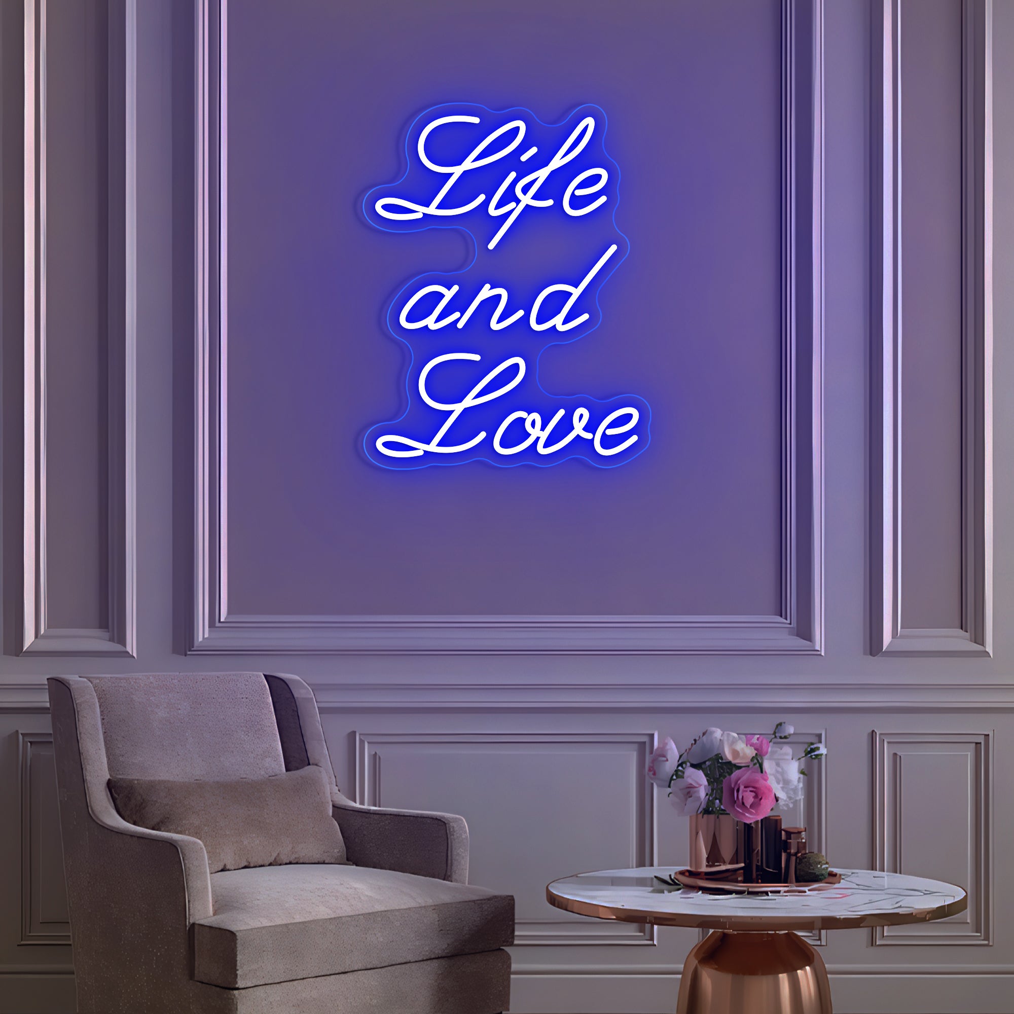Classic & Balanced Typography Design: This sign presents its timeless message with clarity and intention: “Life And Love.” It features the words in a well-proportioned, classic font—such as a clean serif or an elegant modern typeface—with each word respectfully capitalized to give equal weight to both profound concepts. The design is intentionally clear and balanced, transforming an essential truth into a luminous, dignified statement. Expertly crafted in smooth, continuous LED neon lines, it turns a foundational belief into a permanent, radiant focal point for daily contemplation.