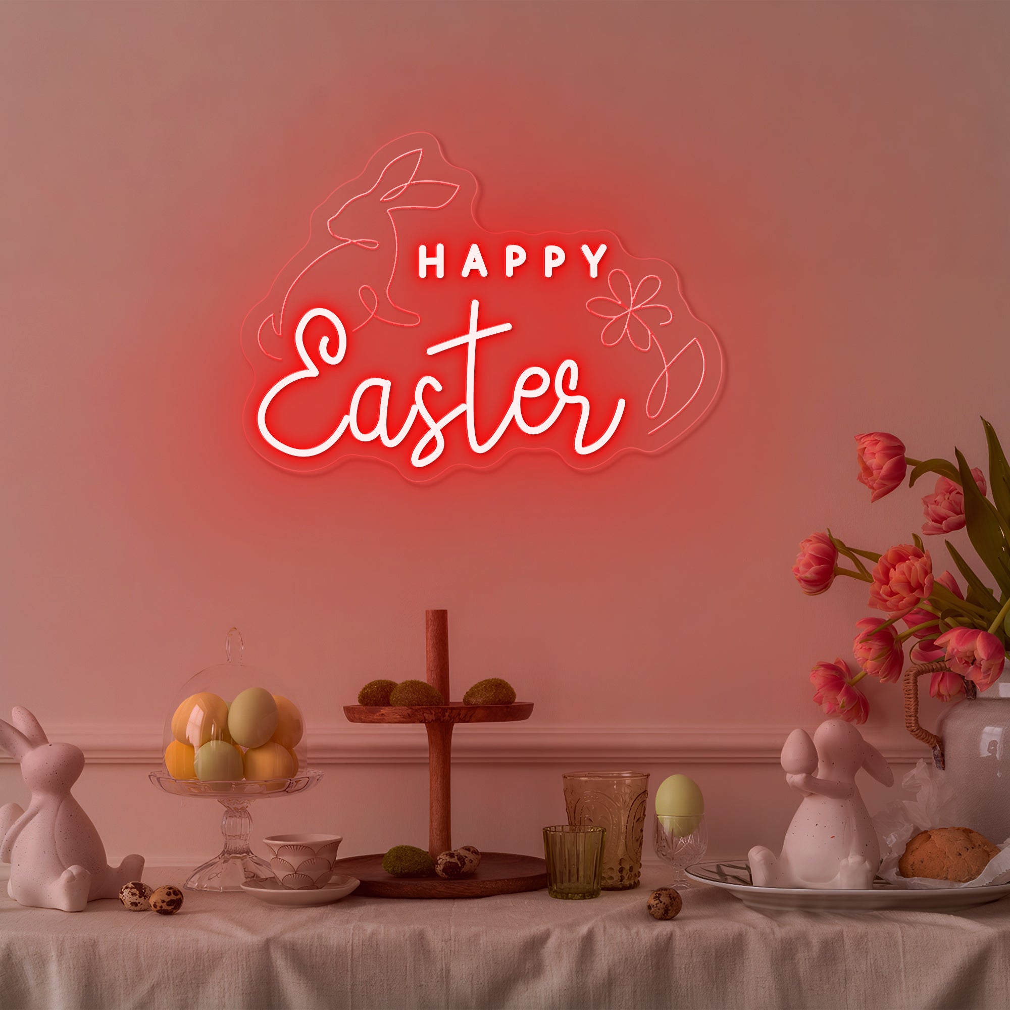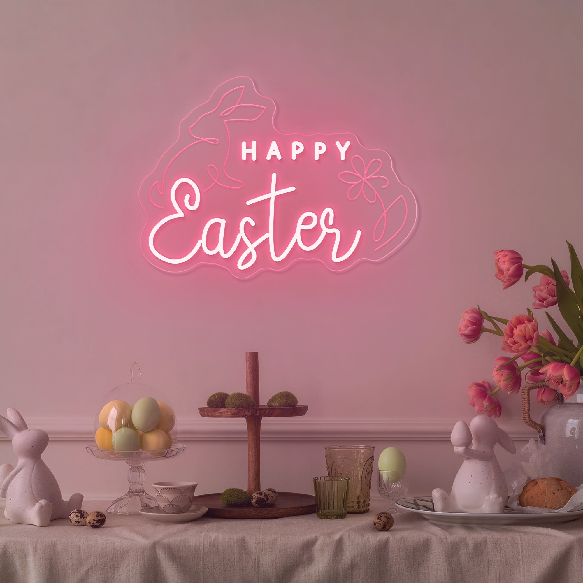 Soft & Festive Glow: Emits a gentle, welcoming light that captures the warmth and hope of Easter morning. It shines in a classic Easter palette of soft pastels—blush pink, buttercream yellow, gentle lavender, and fresh mint green—with the "Happy Easter" message often glowing in a warm, inviting white or gold. This even, cheerful illumination makes every detail—the rabbits' floppy ears, the delicate flower petals, the joyful lettering—appear to glow from within, casting a light that is both sweetly nostalgic and freshly modern. Perfect for creating a warm and magical holiday atmosphere.