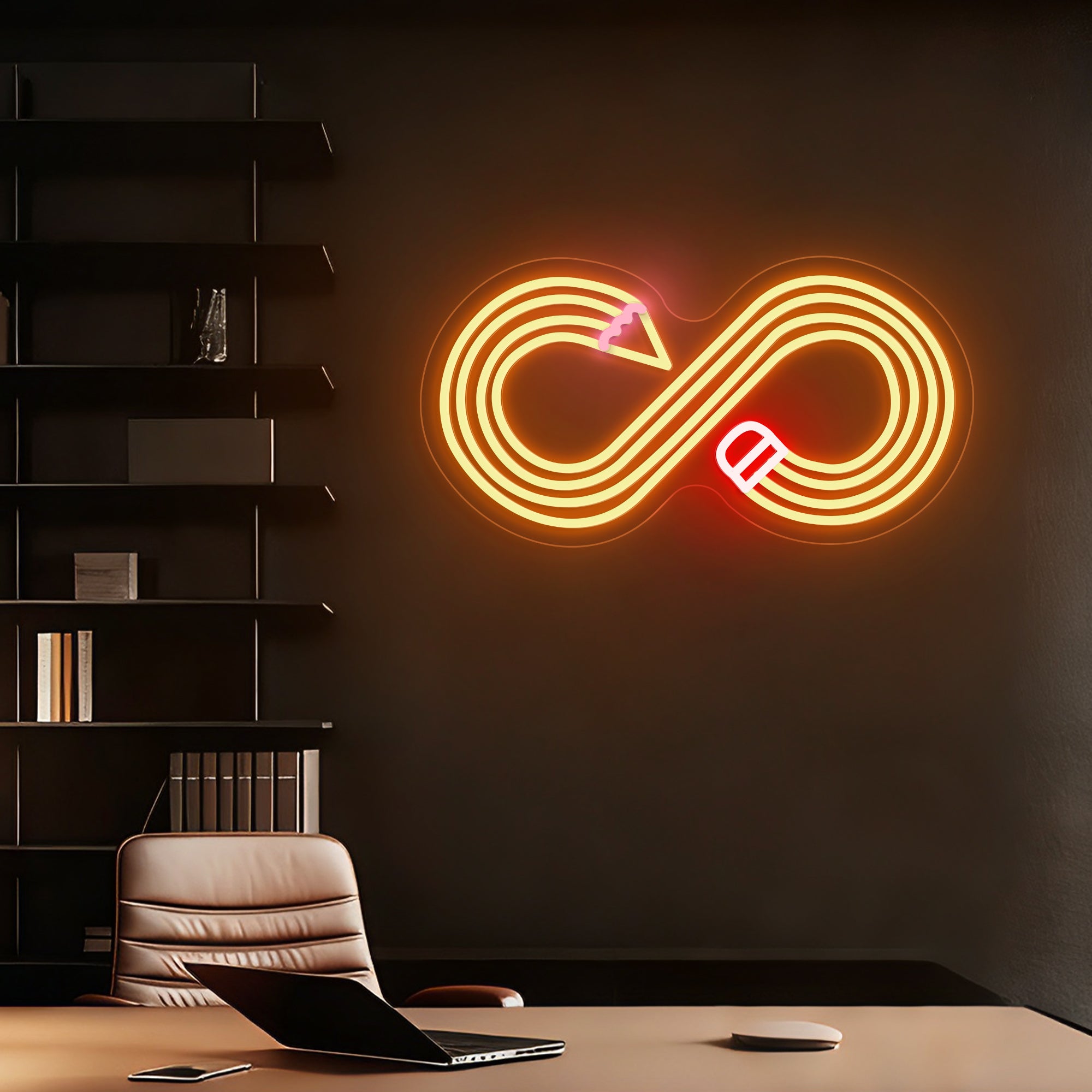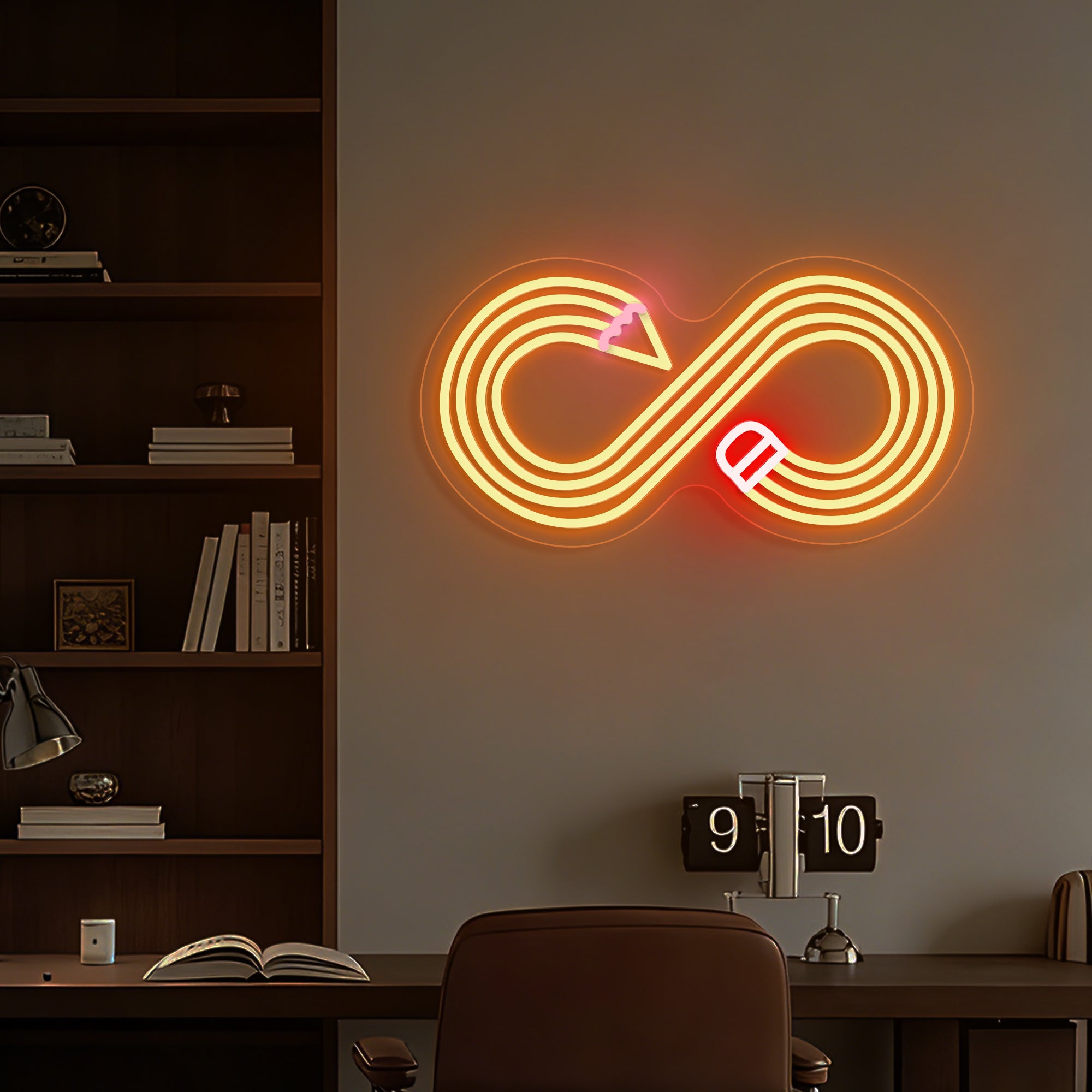 Creative Symbolic Design: This unique sign features a clever visual fusion where a classic pencil is seamlessly shaped into the mathematical symbol for infinity (∞). Crafted from smooth LED neon lines, this design brilliantly combines the tool of learning with the concept of limitless possibility.