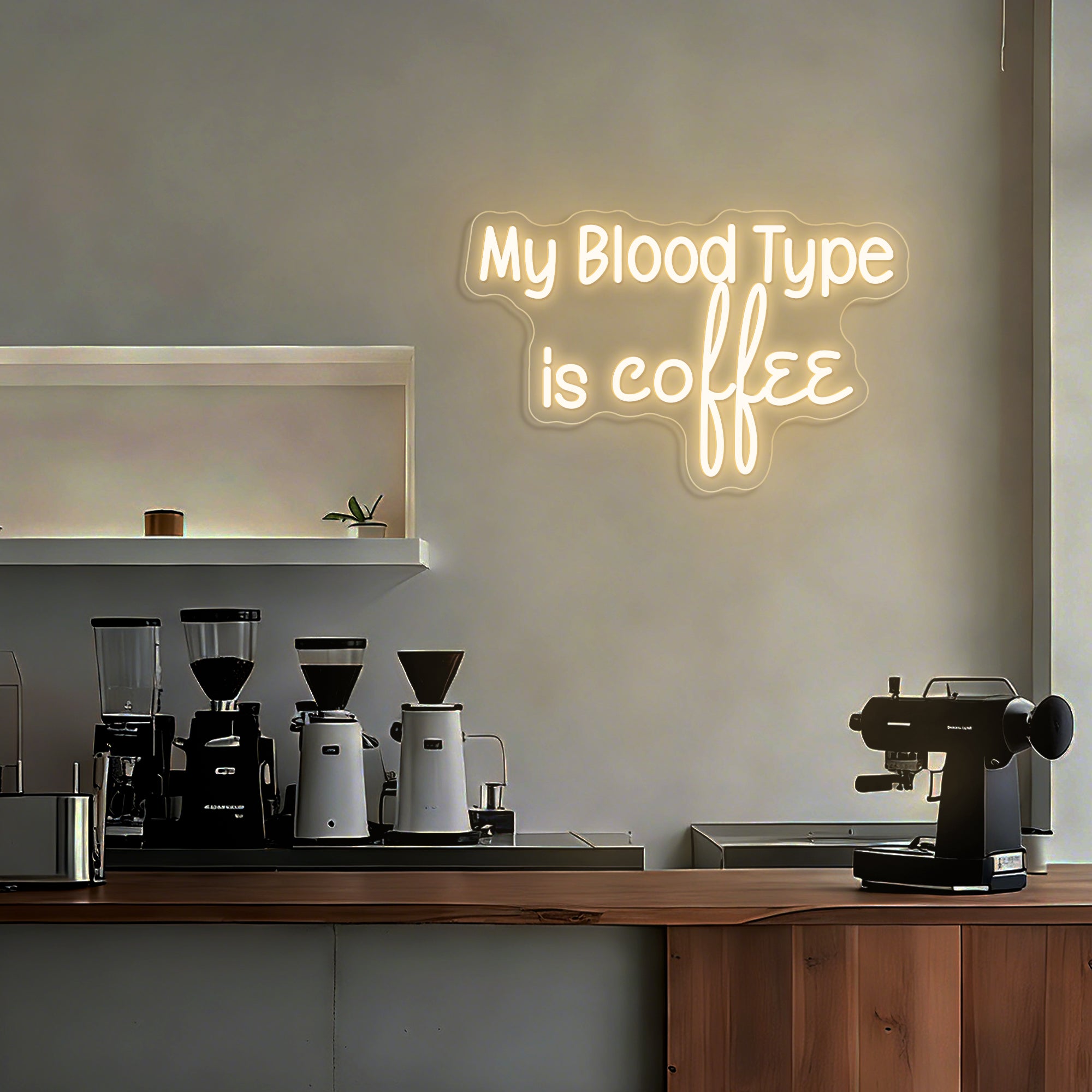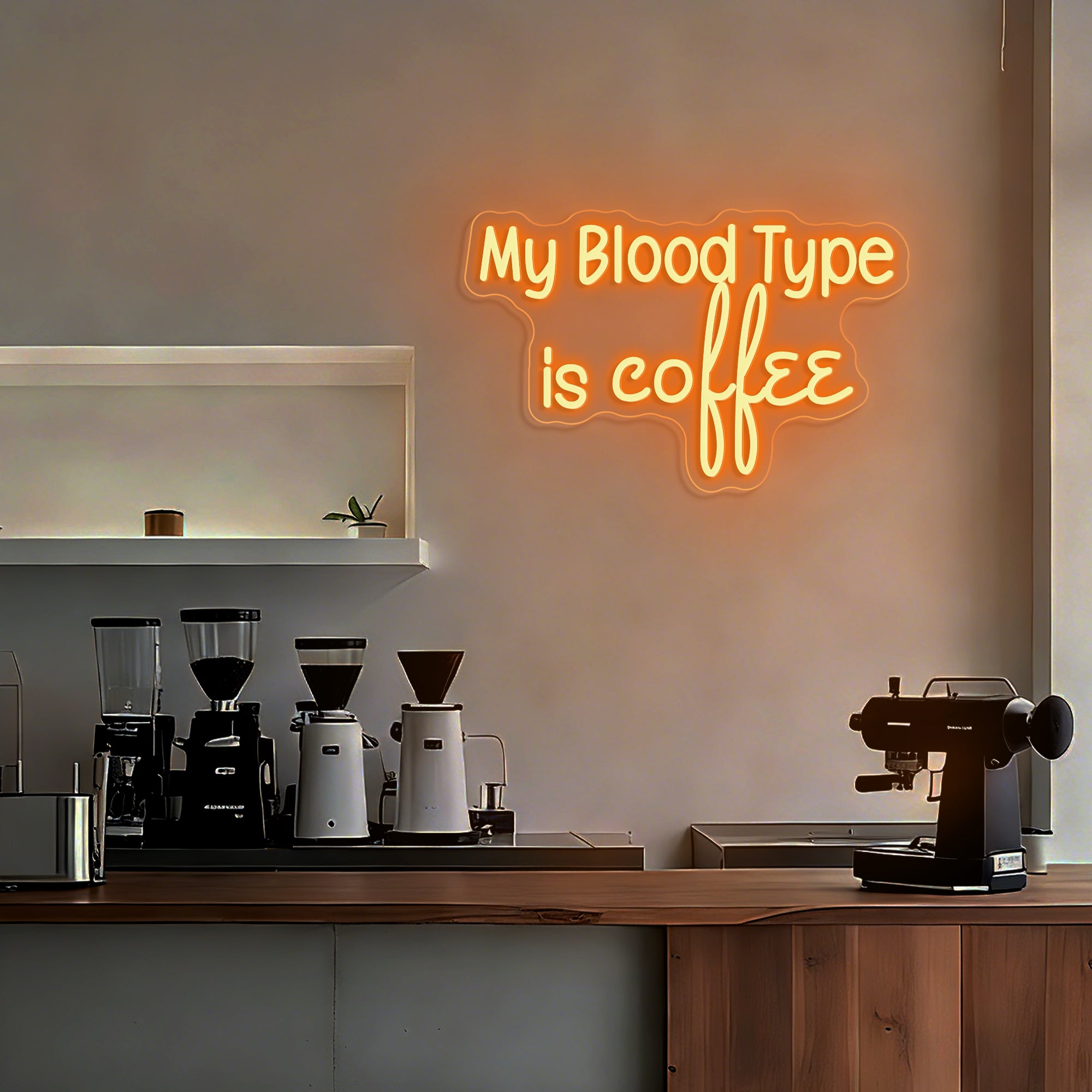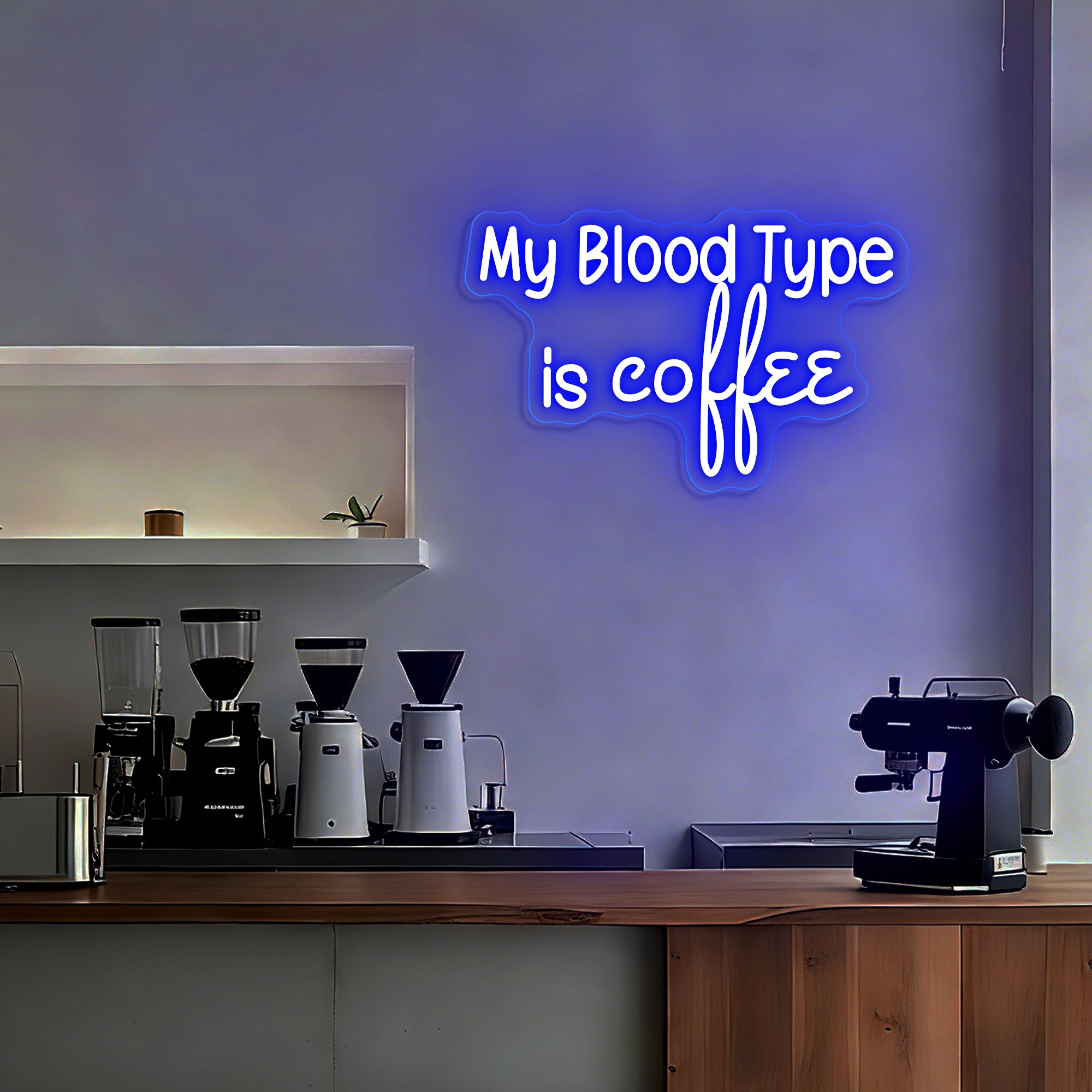 Witty & Relatable Typographic Design: This clever sign declares a universally understood truth with humor and style. It features the bold, self-aware statement "MY BLOOD TYPE IS COFFEE" in a clean, modern font—often using a dual-line or bold single-line design for maximum impact. The text stands alone as a complete graphic, instantly connecting with anyone whose day is powered by caffeine. Expertly rendered in crisp LED neon, it transforms a personal mantra into a luminous, conversation-starting emblem perfect for any business environment.