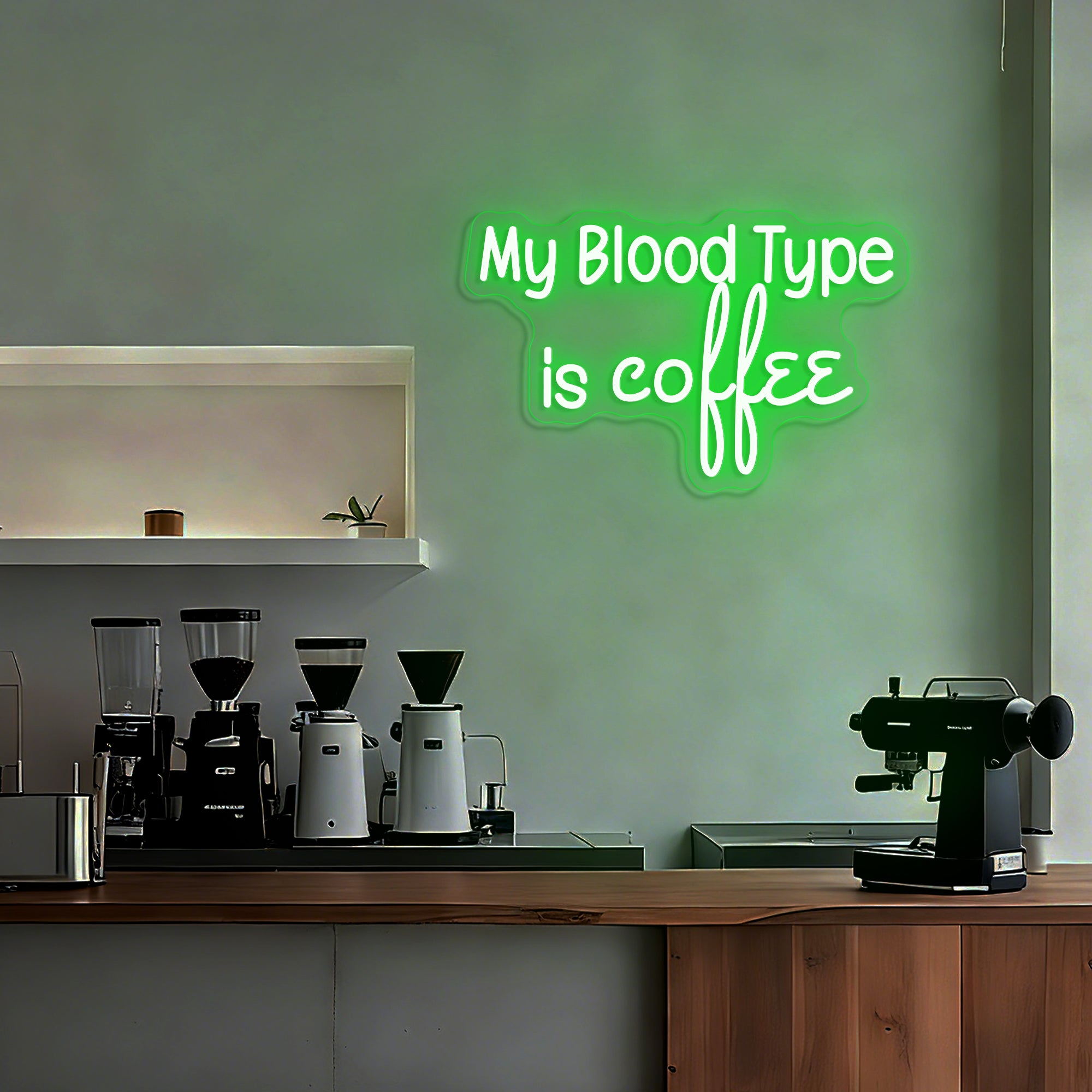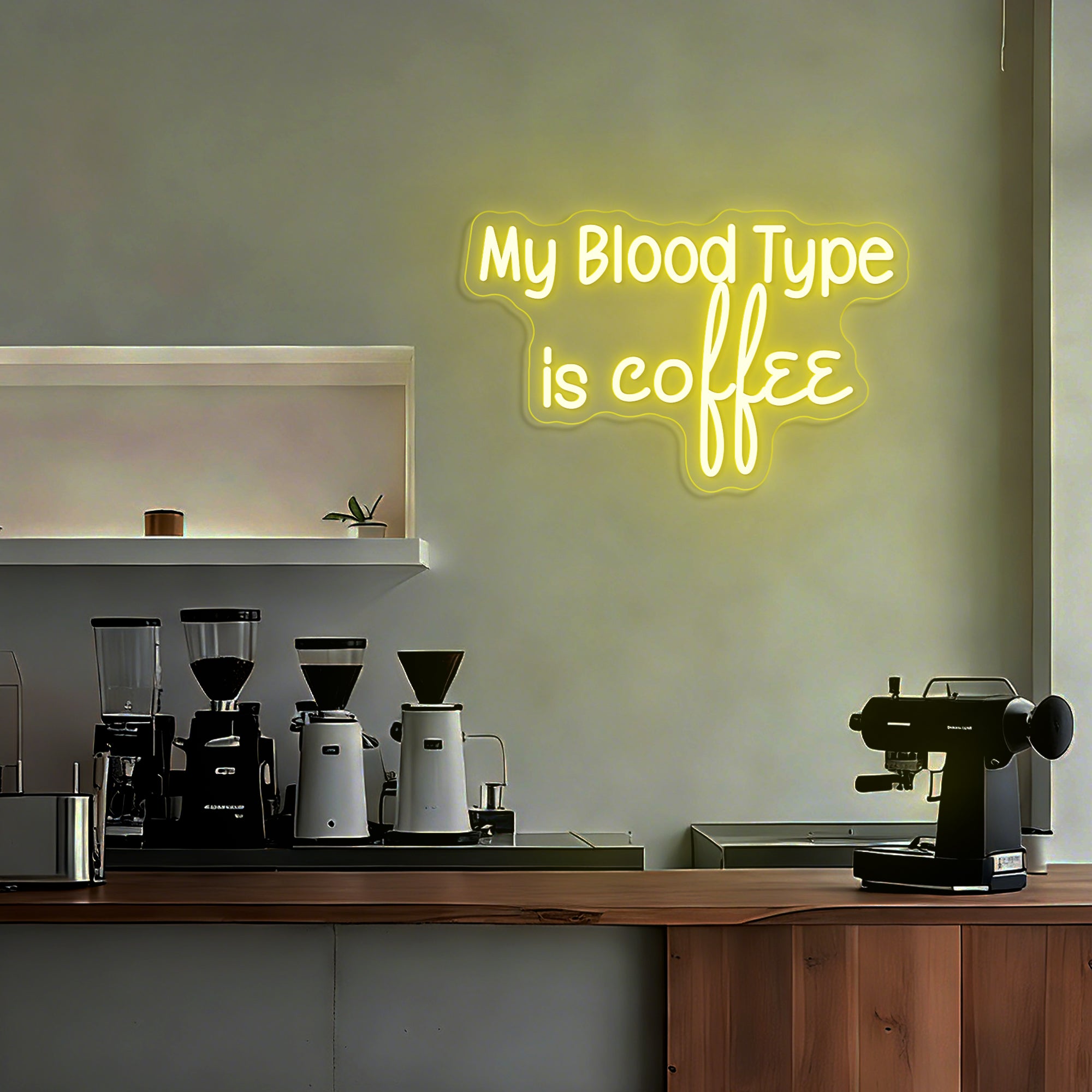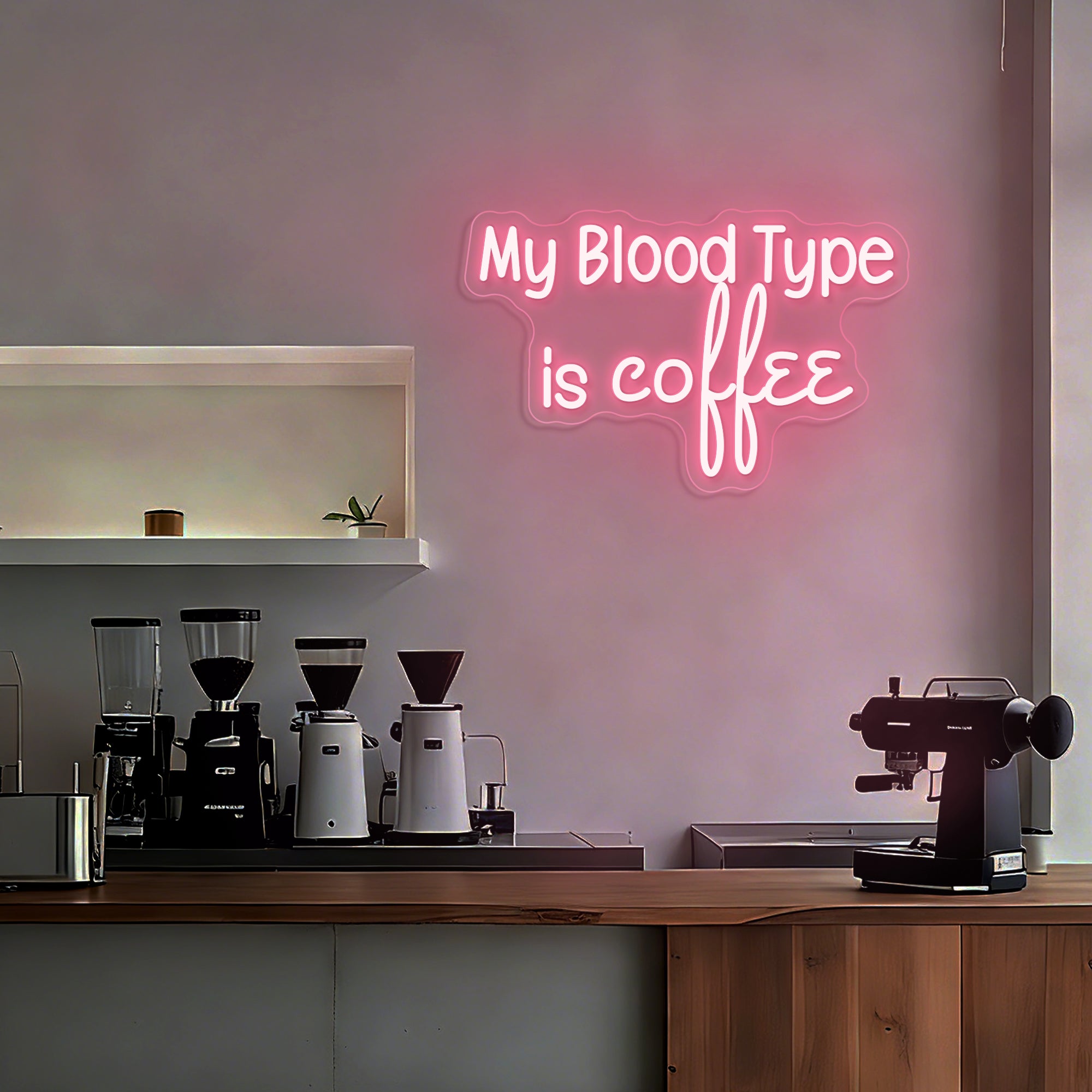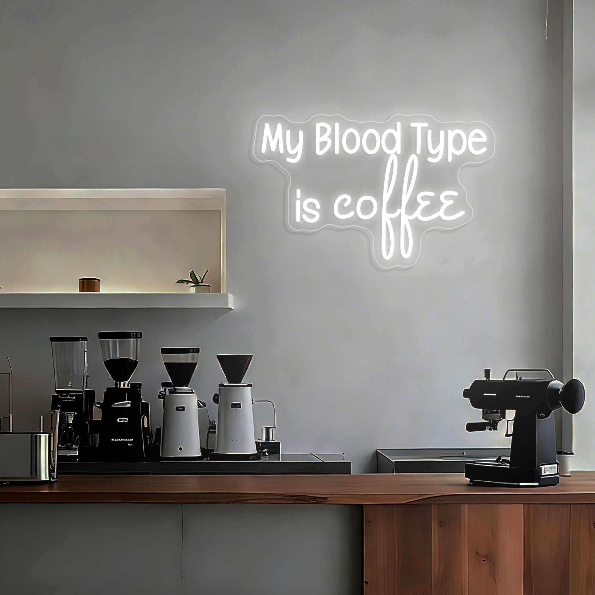 Witty & Relatable Typographic Design: This clever sign declares a universally understood truth with humor and style. It features the bold, self-aware statement "MY BLOOD TYPE IS COFFEE" in a clean, modern font—often using a dual-line or bold single-line design for maximum impact. The text stands alone as a complete graphic, instantly connecting with anyone whose day is powered by caffeine. Expertly rendered in crisp LED neon, it transforms a personal mantra into a luminous, conversation-starting emblem perfect for any business environment.