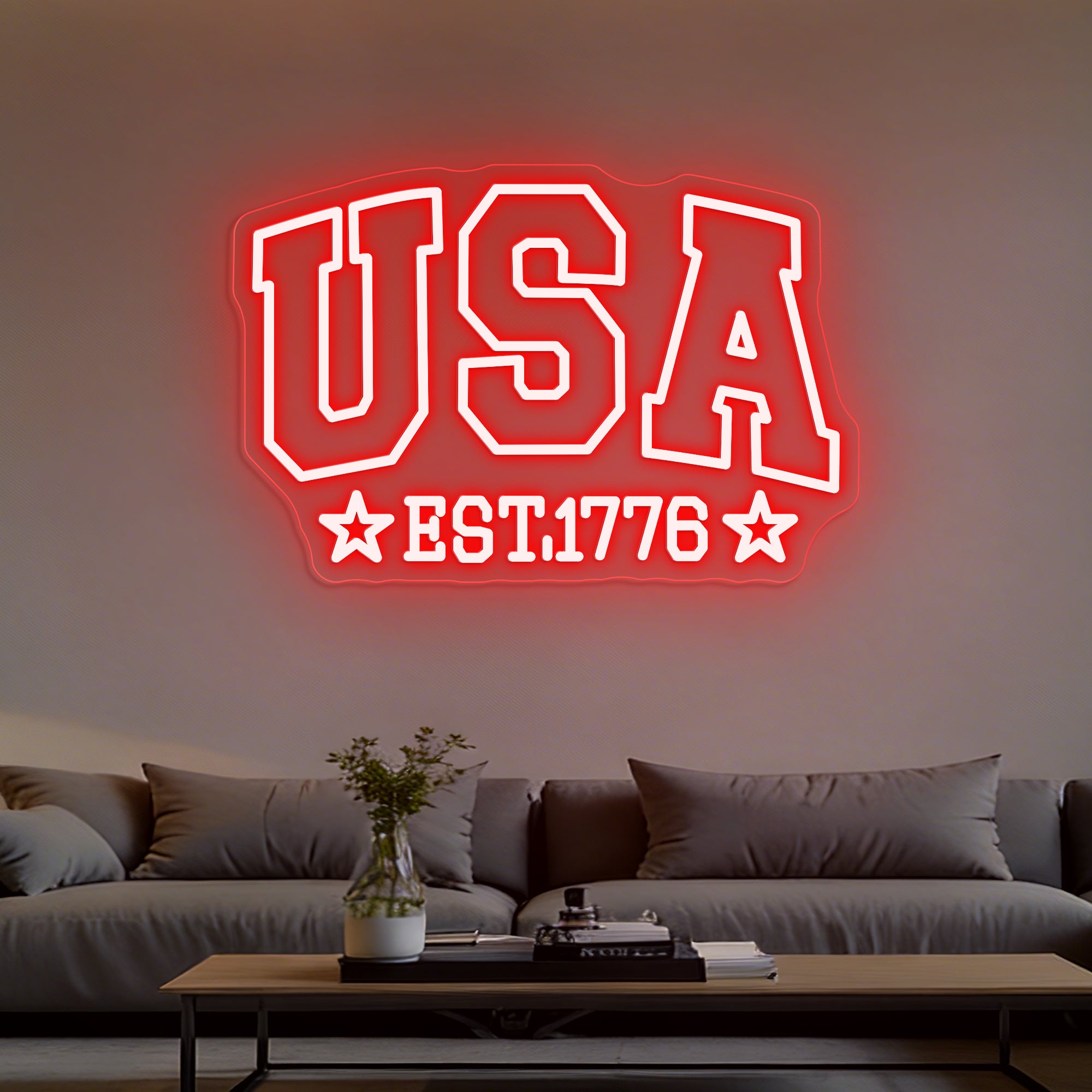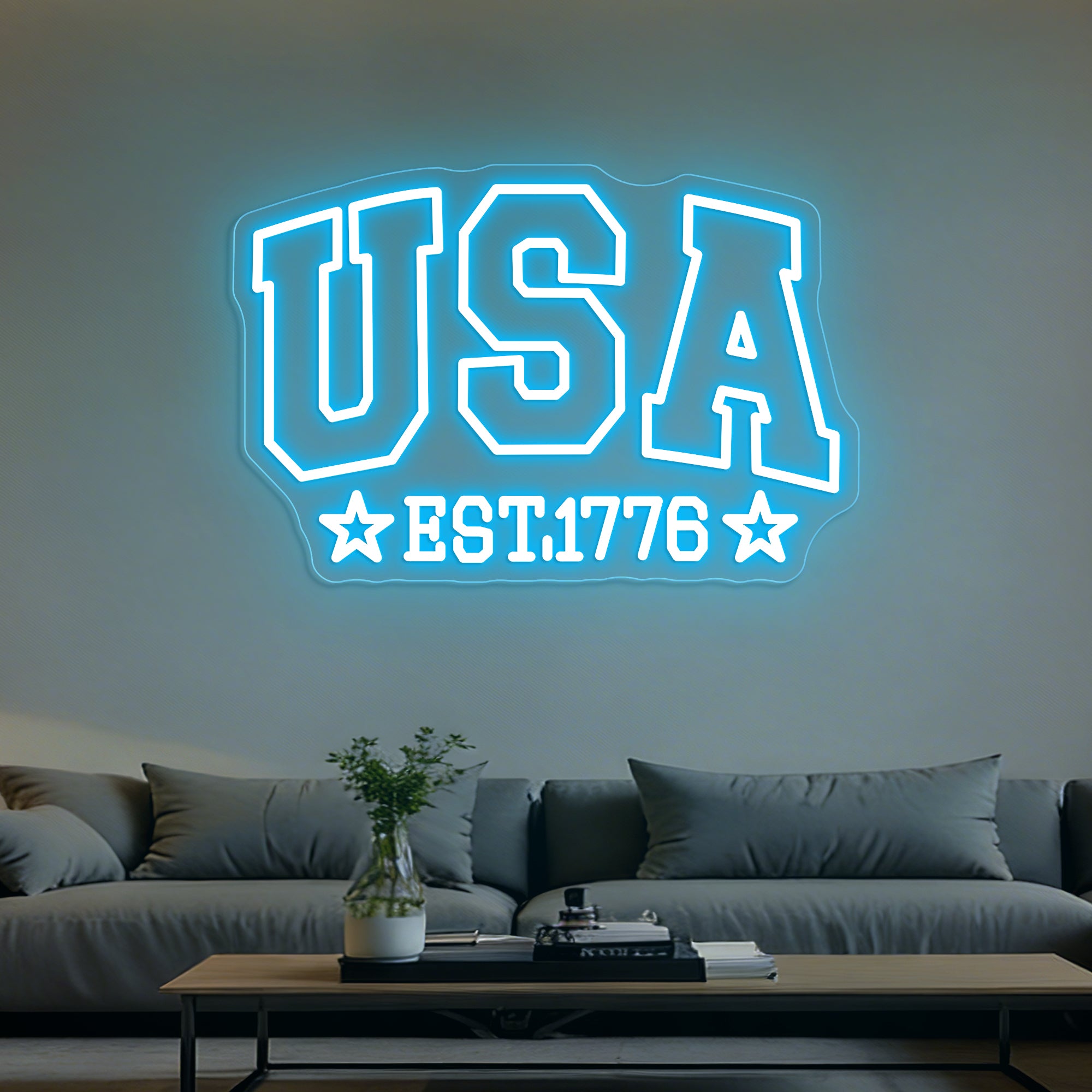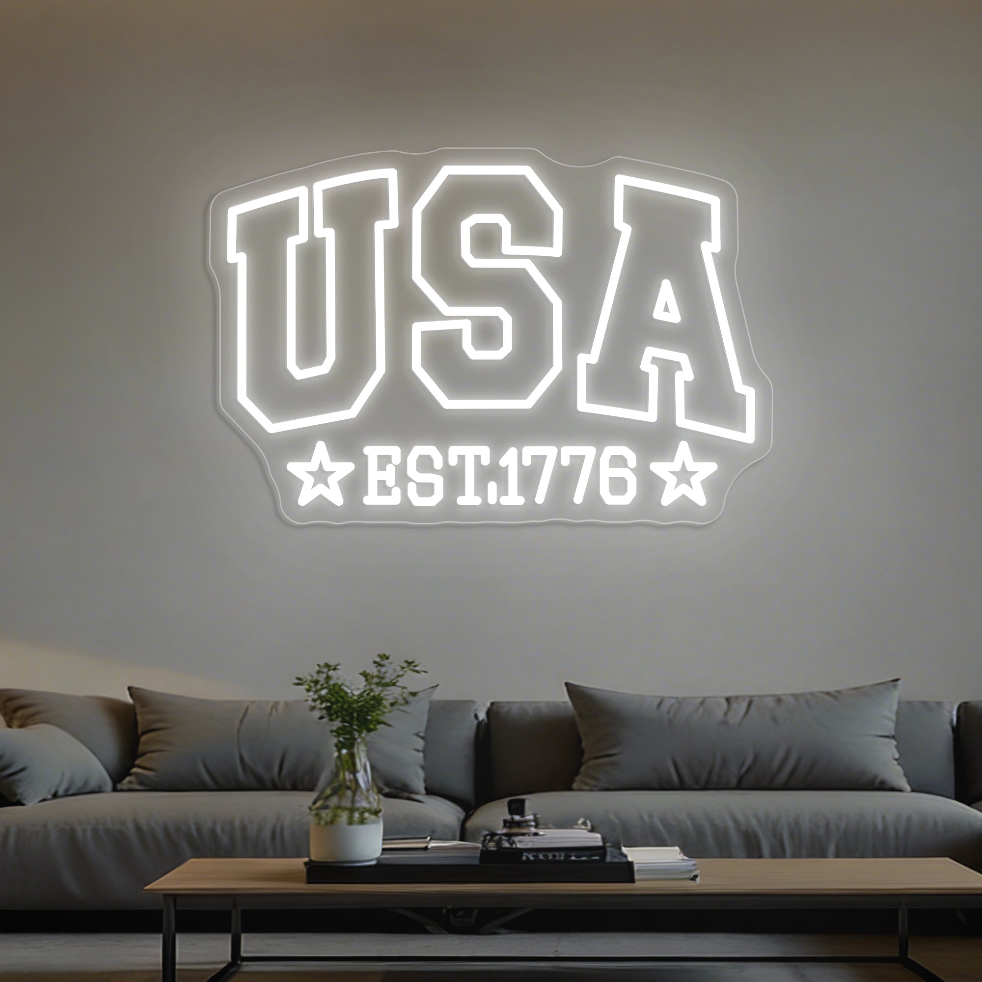 Classic Patriotic Glow: Emits a bright, proud light in the nation’s iconic colors. The design typically shines in a vibrant red for “USA” and the stars, a brilliant white for the dual outlines and “EST”, and a deep blue often used as a backplate or accent color, evoking the American flag. This bold, high-contrast illumination creates a spirited and dignified atmosphere, casting a light that feels both historic and celebratory.