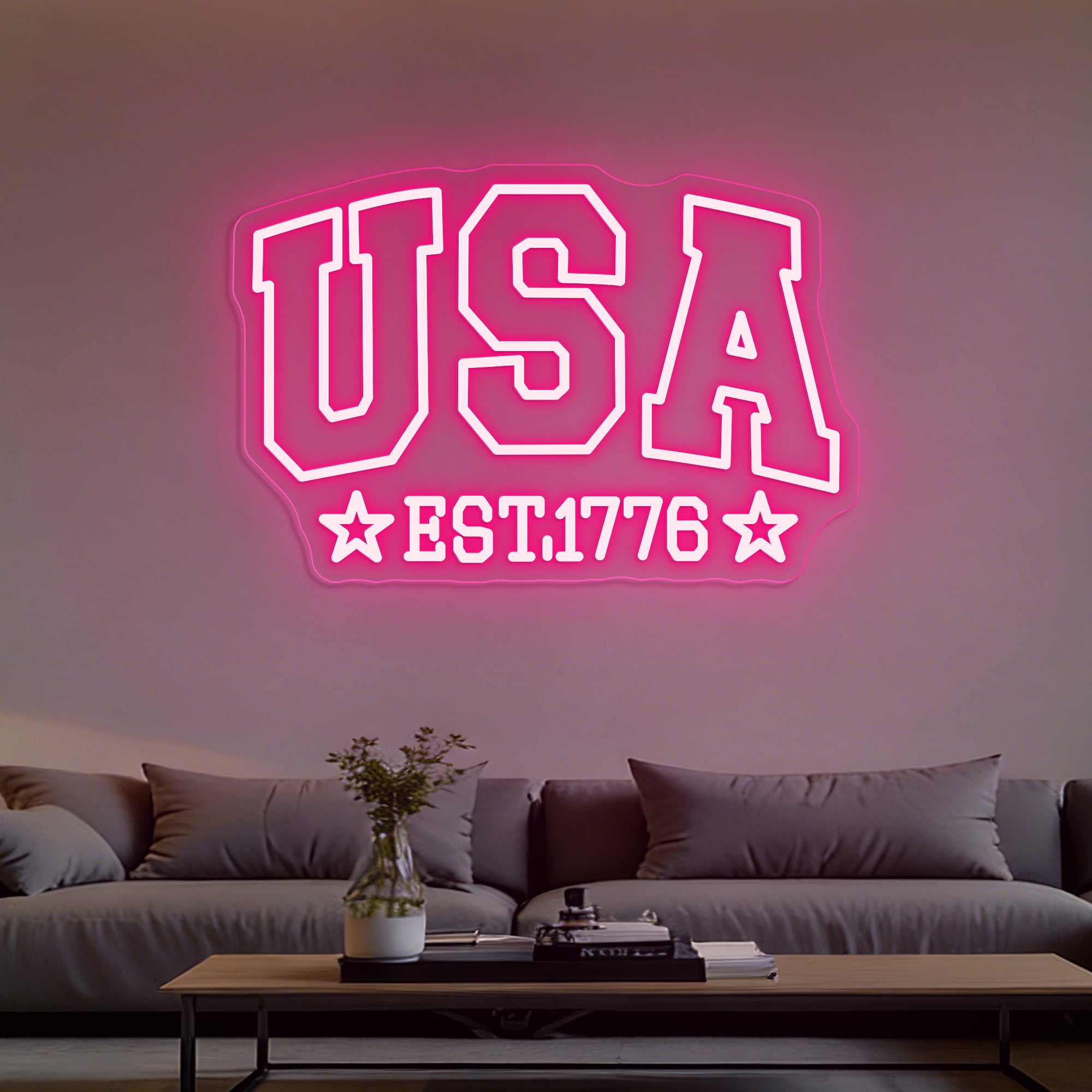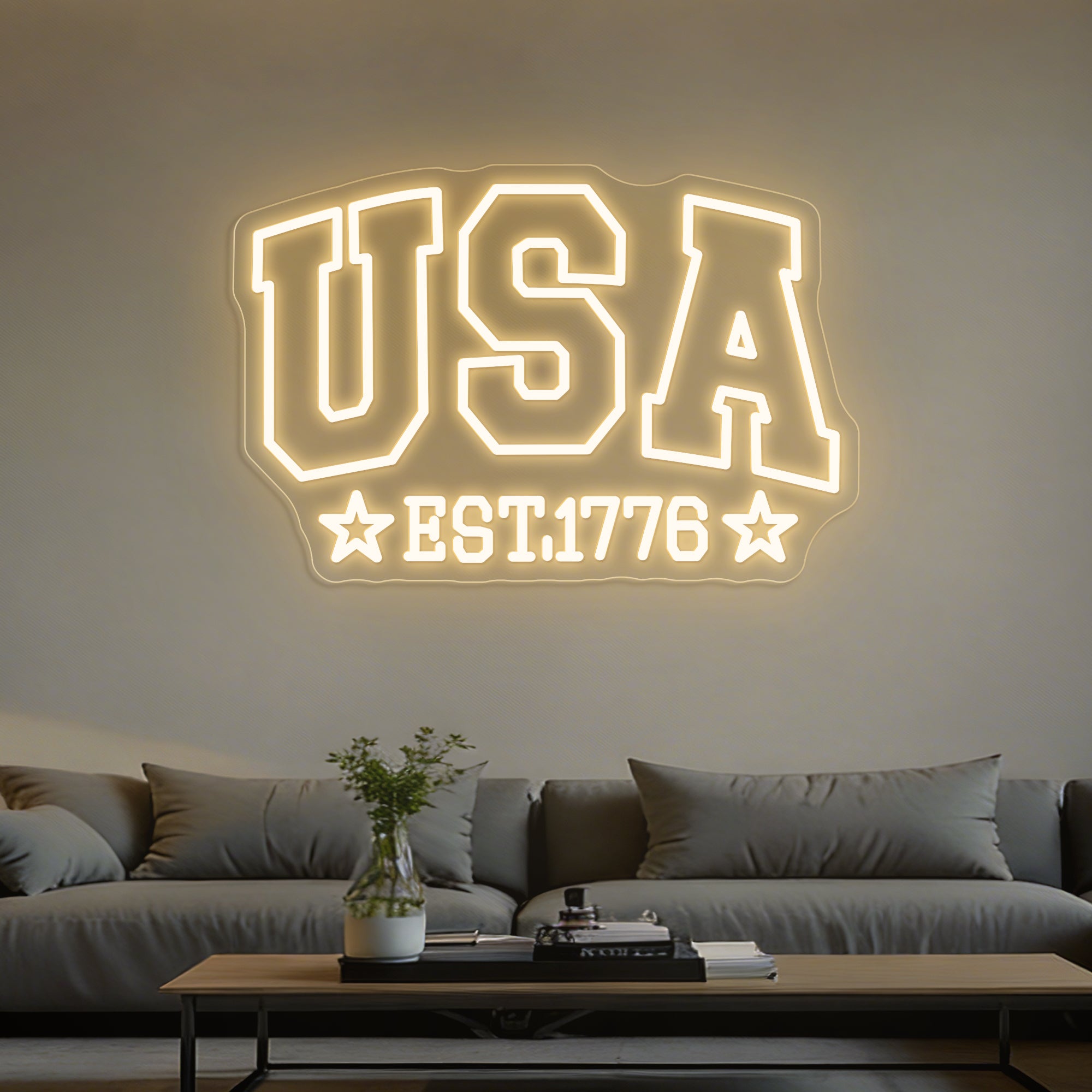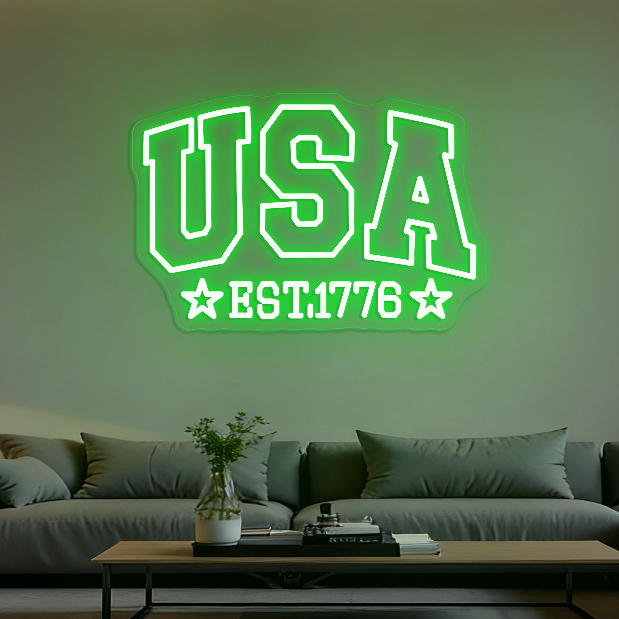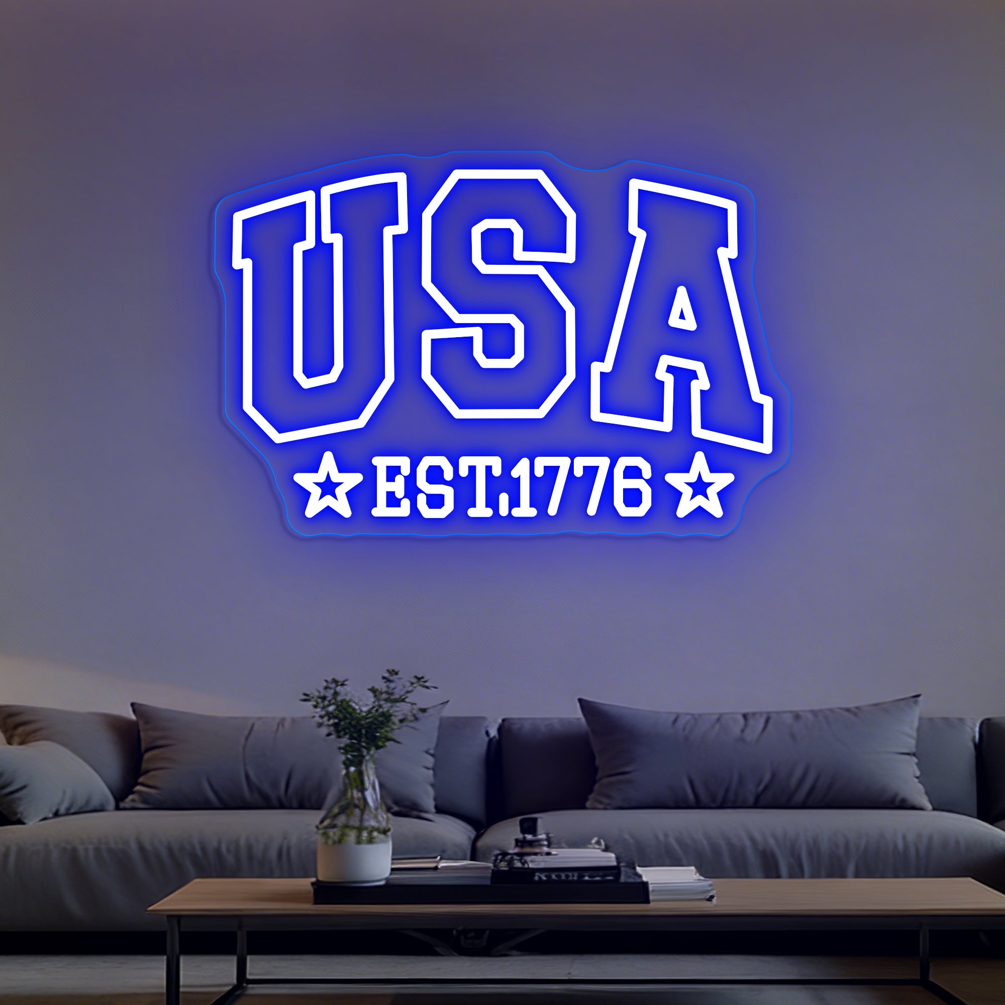 Classic Patriotic Glow: Emits a bright, proud light in the nation’s iconic colors. The design typically shines in a vibrant red for “USA” and the stars, a brilliant white for the dual outlines and “EST”, and a deep blue often used as a backplate or accent color, evoking the American flag. This bold, high-contrast illumination creates a spirited and dignified atmosphere, casting a light that feels both historic and celebratory.