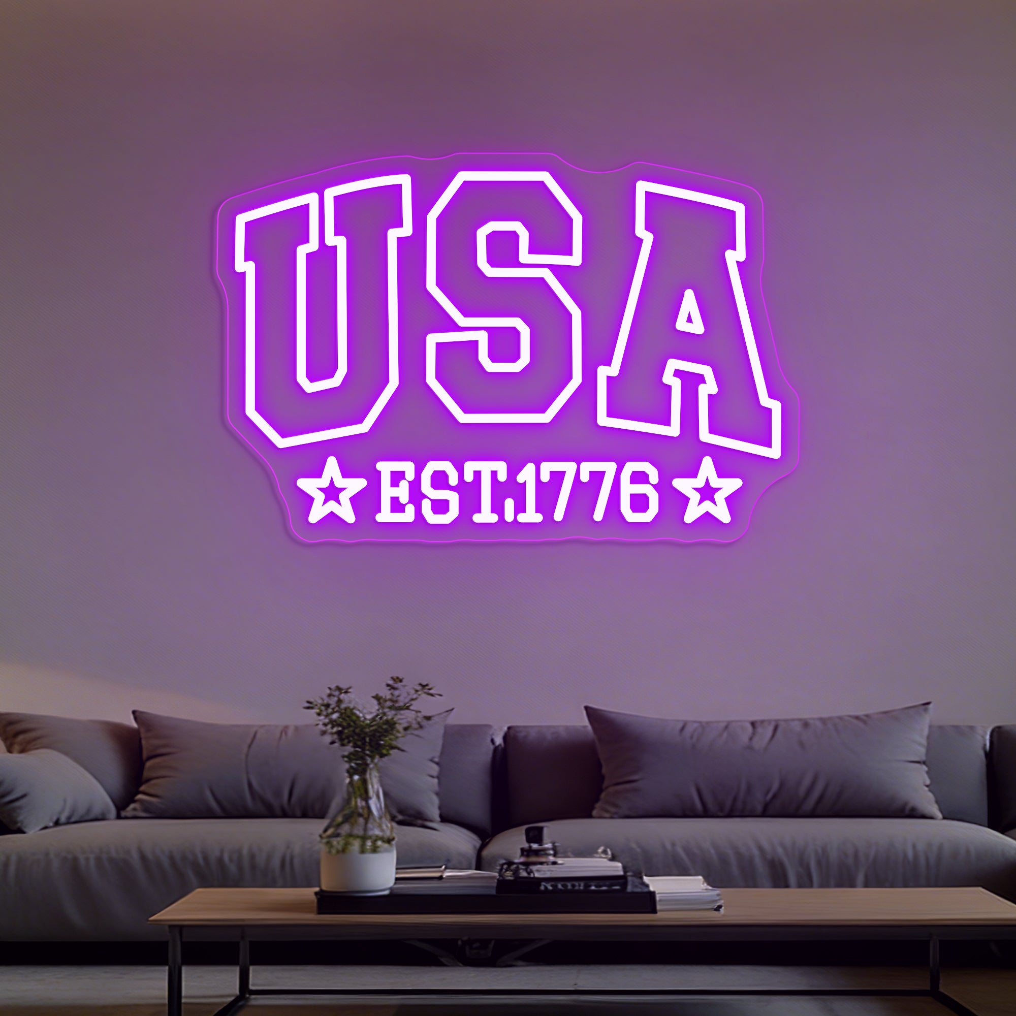 Patriotic & Historical Design: This bold sign is a striking tribute to American heritage and pride. The top features a strong, dual-line “USA” in a classic block font, representing the nation’s modern identity. Centered below is the foundational “EST 1776”, marking the historic year of independence. Flanking the date on both sides are two prominent five-pointed stars, completing a balanced and powerful composition. Expertly crafted in crisp LED neon, this design visually connects the nation’s birth to its enduring symbol—the star—creating a clean, iconic, and deeply patriotic statement.