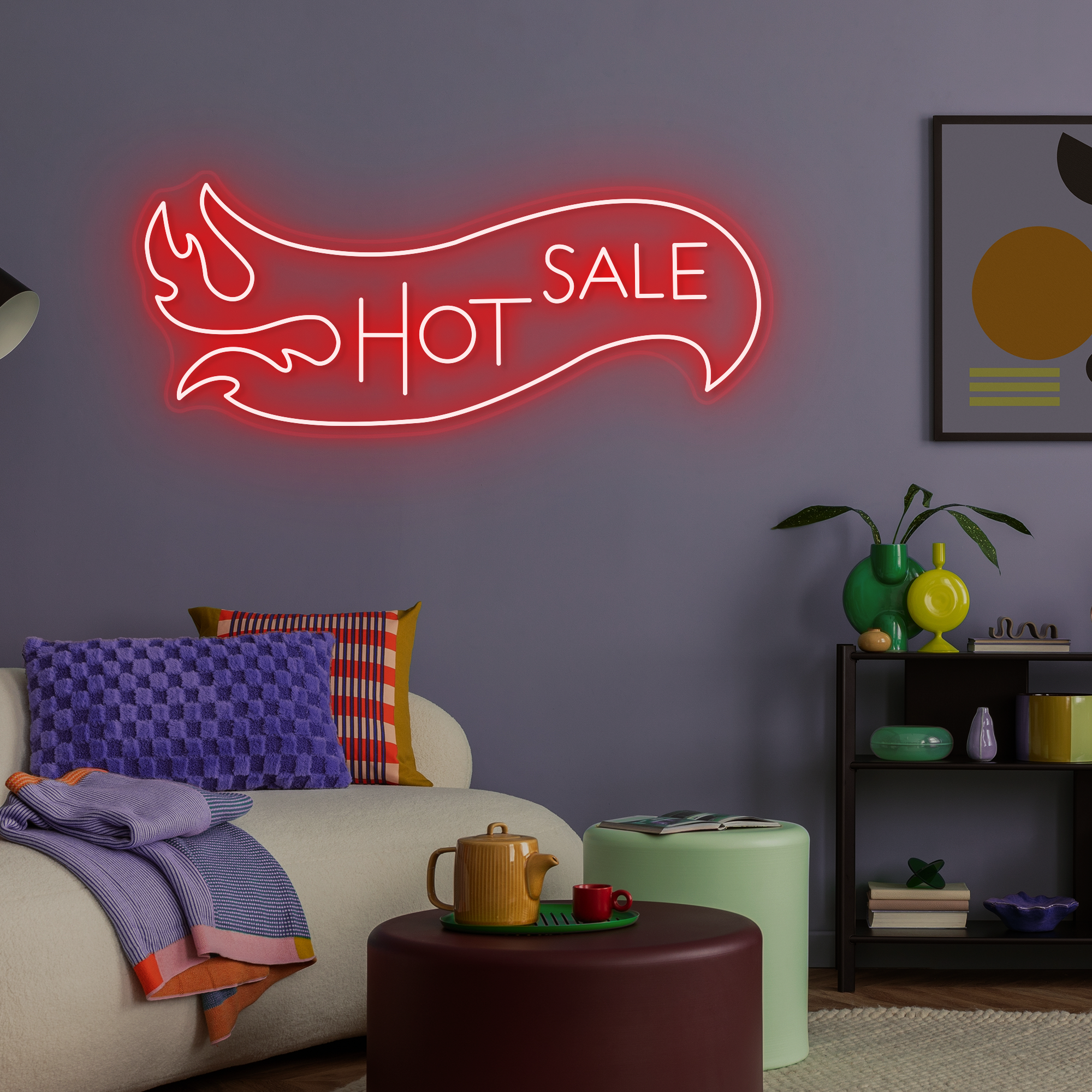 Dynamic Sale Design: This eye-catching sign boldly displays the words "HOT SALE" in energetic, modern lettering, dramatically accented with stylized LED flame motifs that appear to leap and flicker, creating an irresistible sense of urgency and excitement.