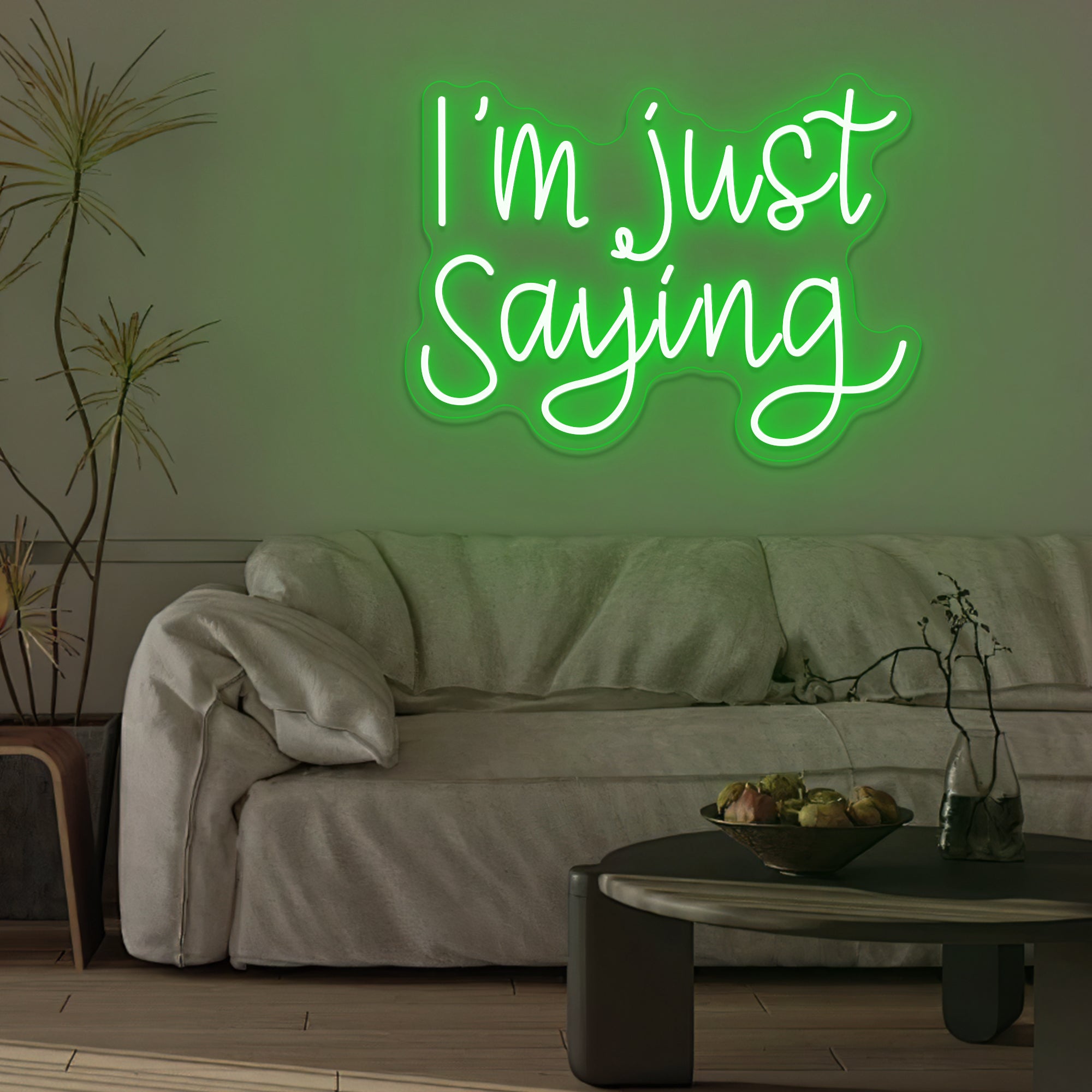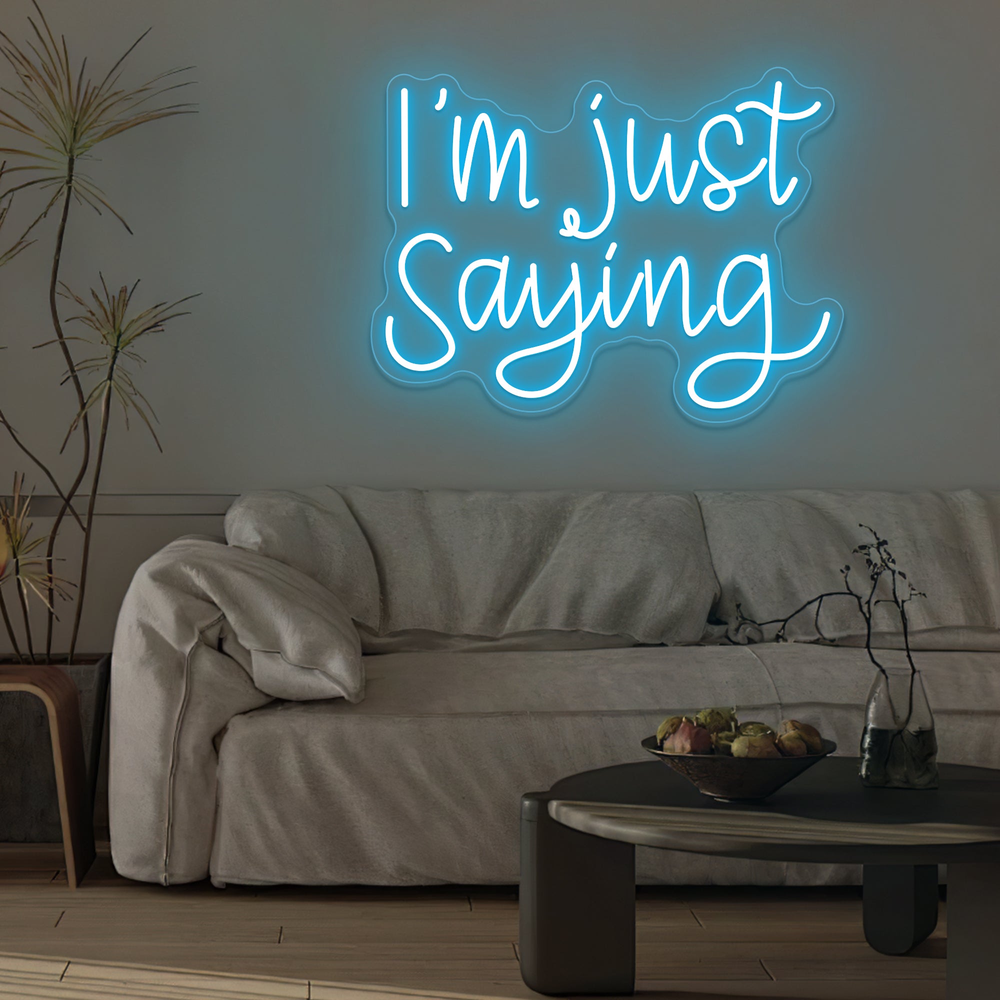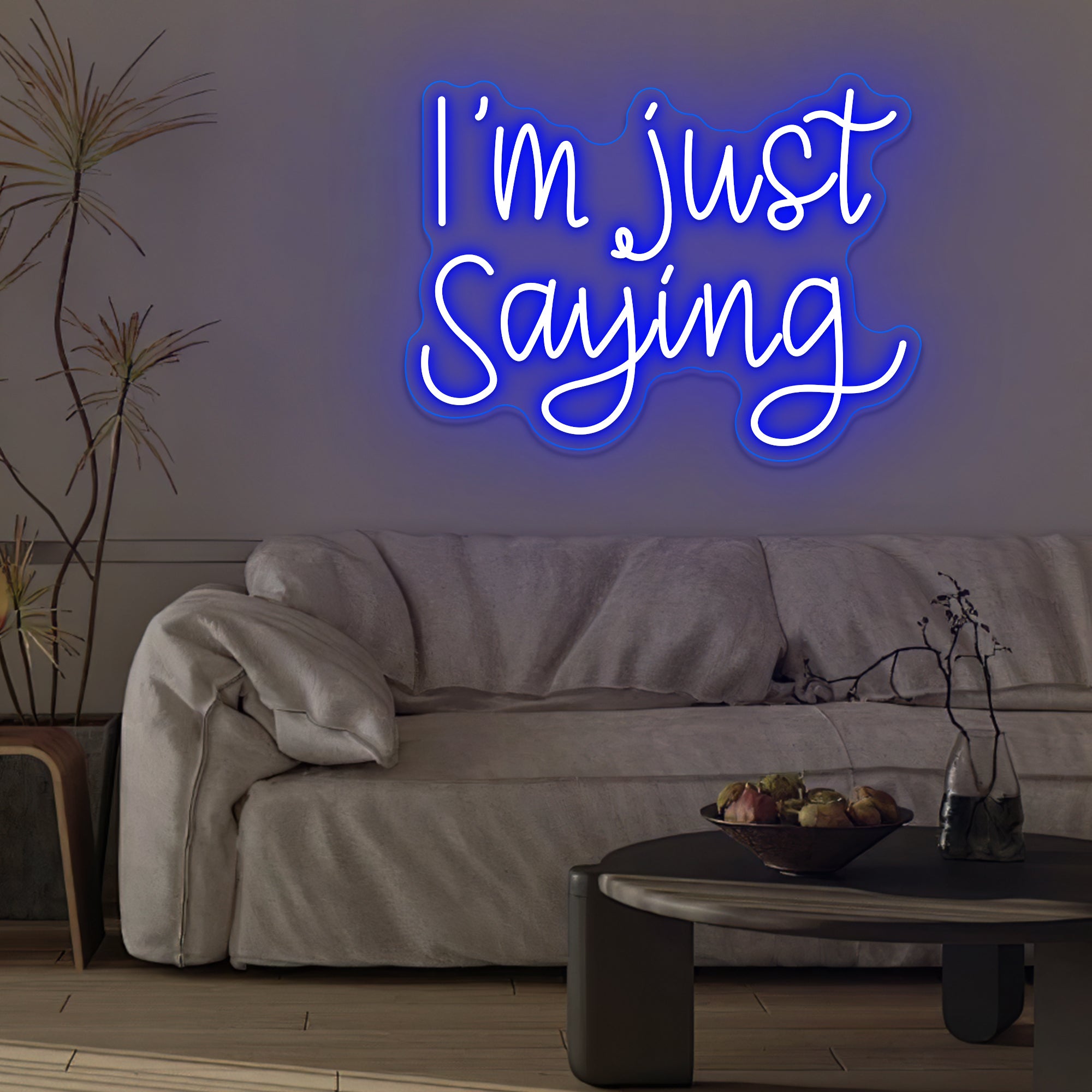 Casual & Conversational Typography: This sign captures a modern, offhand phrase with the relatable quote “I’M JUST SAYING” rendered in a clean, approachable font—often a smooth, casual script or a relaxed sans-serif. Designed with crisp dual-line LED neon, the text feels like a friendly aside made permanent, turning a casual expression into a witty and thought-provoking piece of wall art that invites a smile or a nod of agreement.