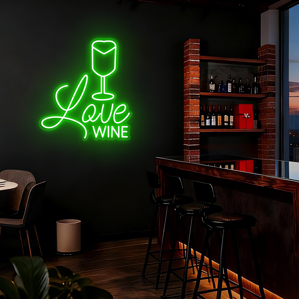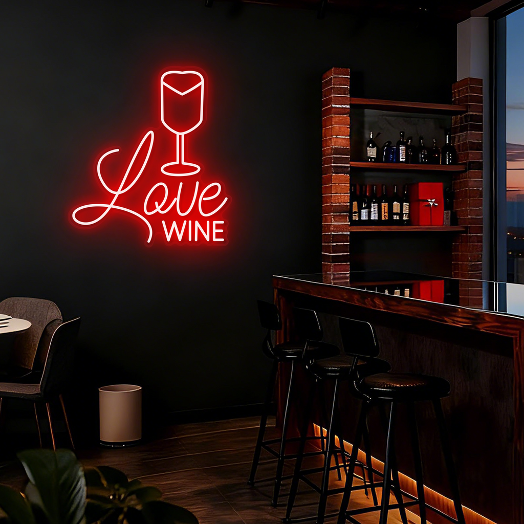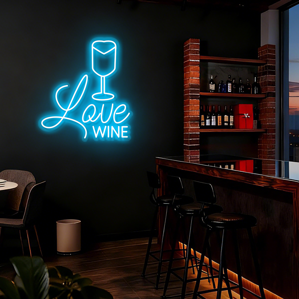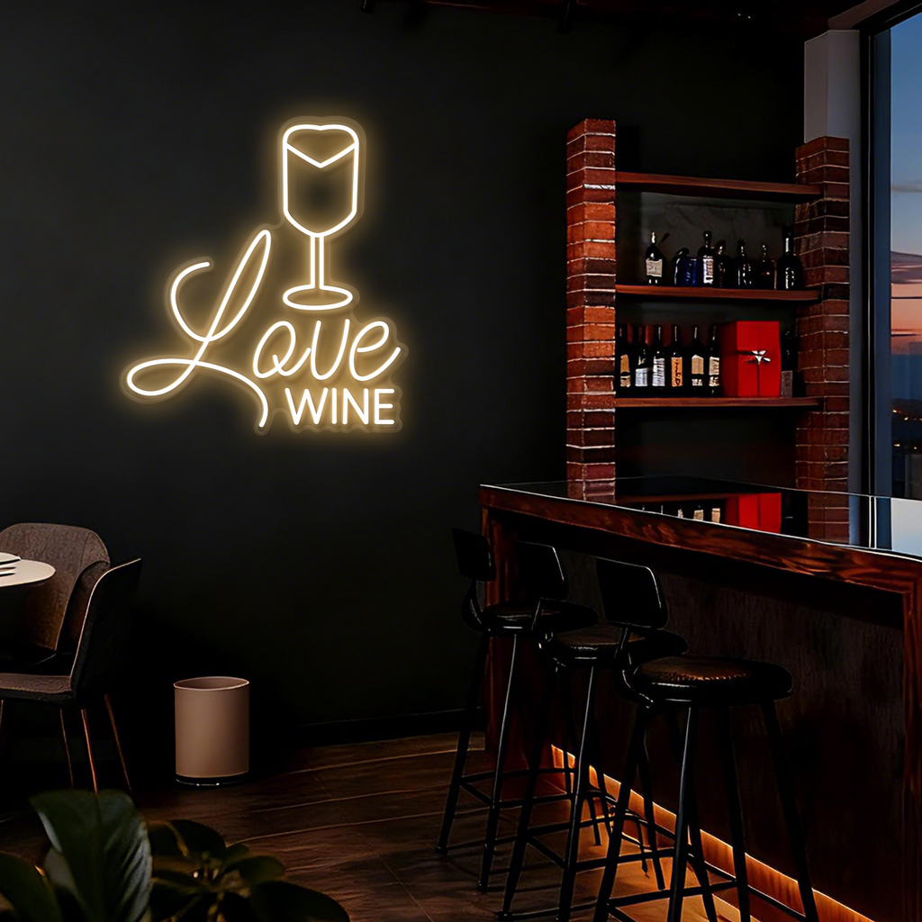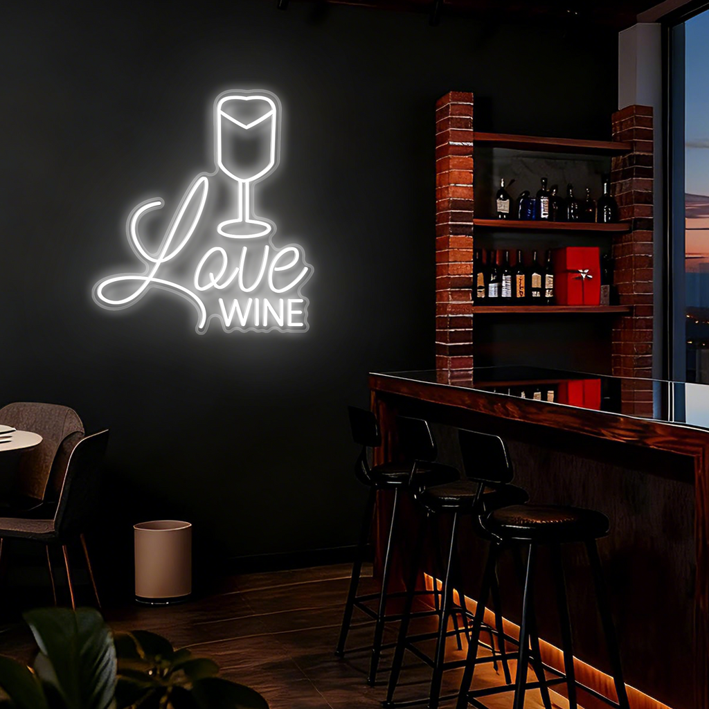 Elegant Wine Glass Design: Features a classic and elegant wine glass silhouette crafted from smooth LED neon lines, paired with the charming phrase "Love Wine" in a complementary script below.