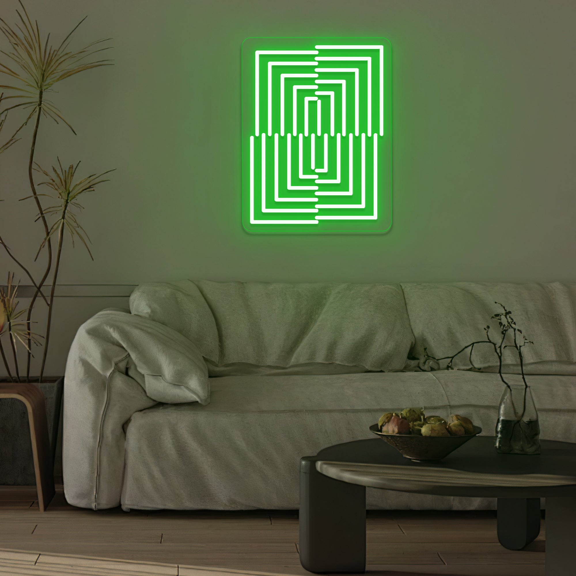 Abstract Geometric Composition: This sign transcends literal imagery, featuring a series of vertically staggered rectangular bars or lines of varying lengths and spacing. Rendered in pure, uninterrupted LED neon, the composition explores form, rhythm, and negative space. Inspired by mid-century modernism and contemporary abstract art, it transforms simple geometric elements into a luminous study of balance, proportion, and light itself—making a sophisticated statement that speaks through silence and form.