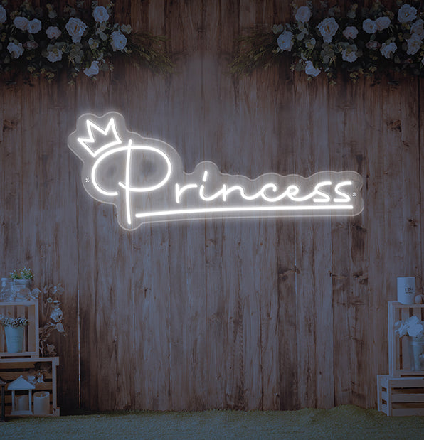 Whimsical & Regal Typography Design: This sign is a dream come true for any little royal. It features the majestic word “Princess” in a playful, elegant script. The crowning touch is a delicate, sparkling crown icon gracefully nestled above the first letter. The design is intentionally charming and celebratory, transforming a beloved title into a luminous declaration fit for a party. Expertly crafted in smooth, continuous LED neon, it turns a fantasy into a radiant focal point for her special day.