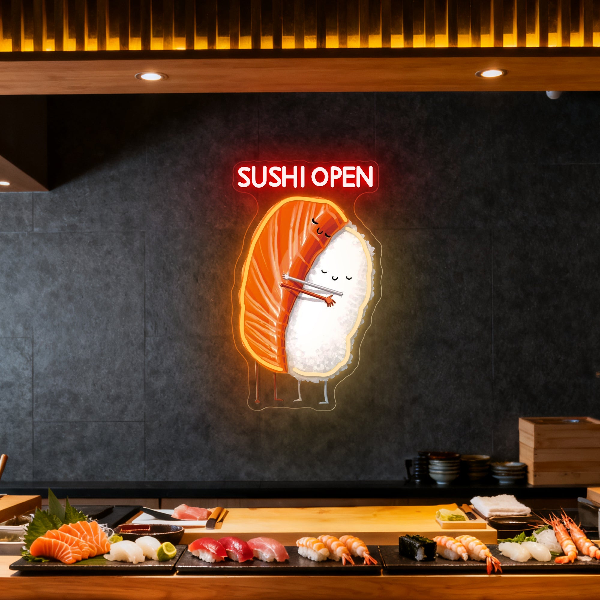 Welcome customers with a smile using our charming Sushi neon sign. This heartwarming design features a cute personified salmon and rice sharing a loving embrace, creating an instant emotional connection with your guests. Perfect for sushi bars, Japanese restaurants, or any food establishment, it communicates freshness, quality, and a playful approach to dining. The delightful characters will make your restaurant memorable and share-worthy on social media.